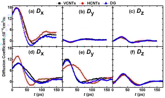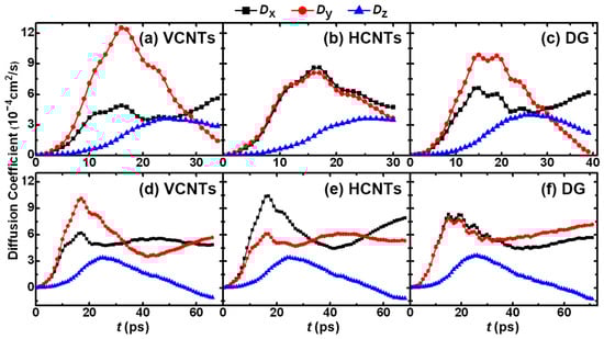 Figure 8 shows the D at the FC stage for the cases of two and three films with R = 101.7 Å. In terms of the cases with two films, Figure 8a–c reveal that the diffusion along the x direction plays a dominant role in the FC due to the Dx value being much larger than the Dy and Dz values. Moreover, the Dy/Dx-t curves nearly overlap with respect to different substrates. However, in the cases of three films, both the diffusions along the x and y directions play important roles in coalescence due to the fact that both the Dx and Dy are far larger than the Dz, as indicated by Figure 8d–f. Notably, the overlaps of the D-t lines suggest that the D on VCNTs is generally equal to that on DG. However, on HCNTs, the Dx varies rapidly and then reaches the plateau at about 85 ps, while the Dy changes gradually and becomes constant after 150 ps. This means that the diffusions along the x and y directions on this substrate approach the equilibrium at different times, which is possibly because the drops on HCNTs are greatly elongated in the y direction (Figure 4), finally leading to the later equilibrium in the y direction compared with the x direction.