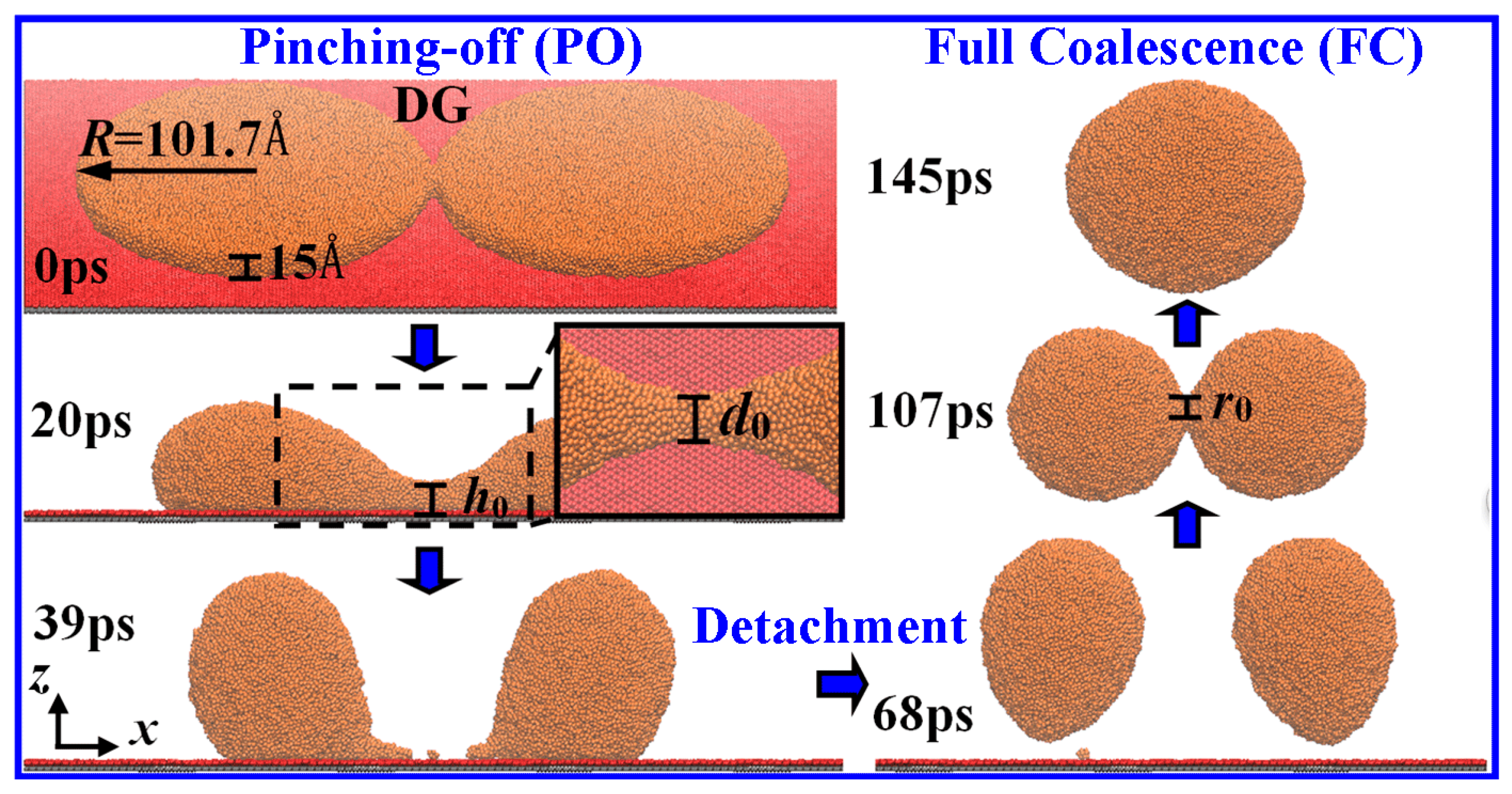 - Li, X.Y.; He, Y.Z.; Wang, Y.; Dong, J.C.; Li, H. Dewetting properties of metallic liquid film on nanopillared graphene. Sci. Rep. 2014, 4, 3938. [Google Scholar] [CrossRef]