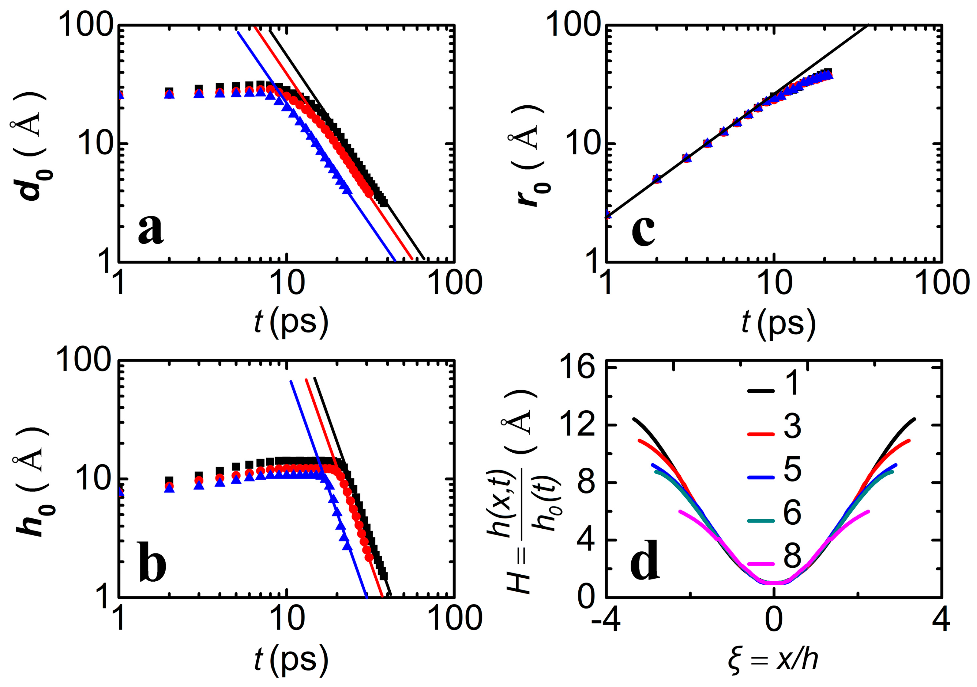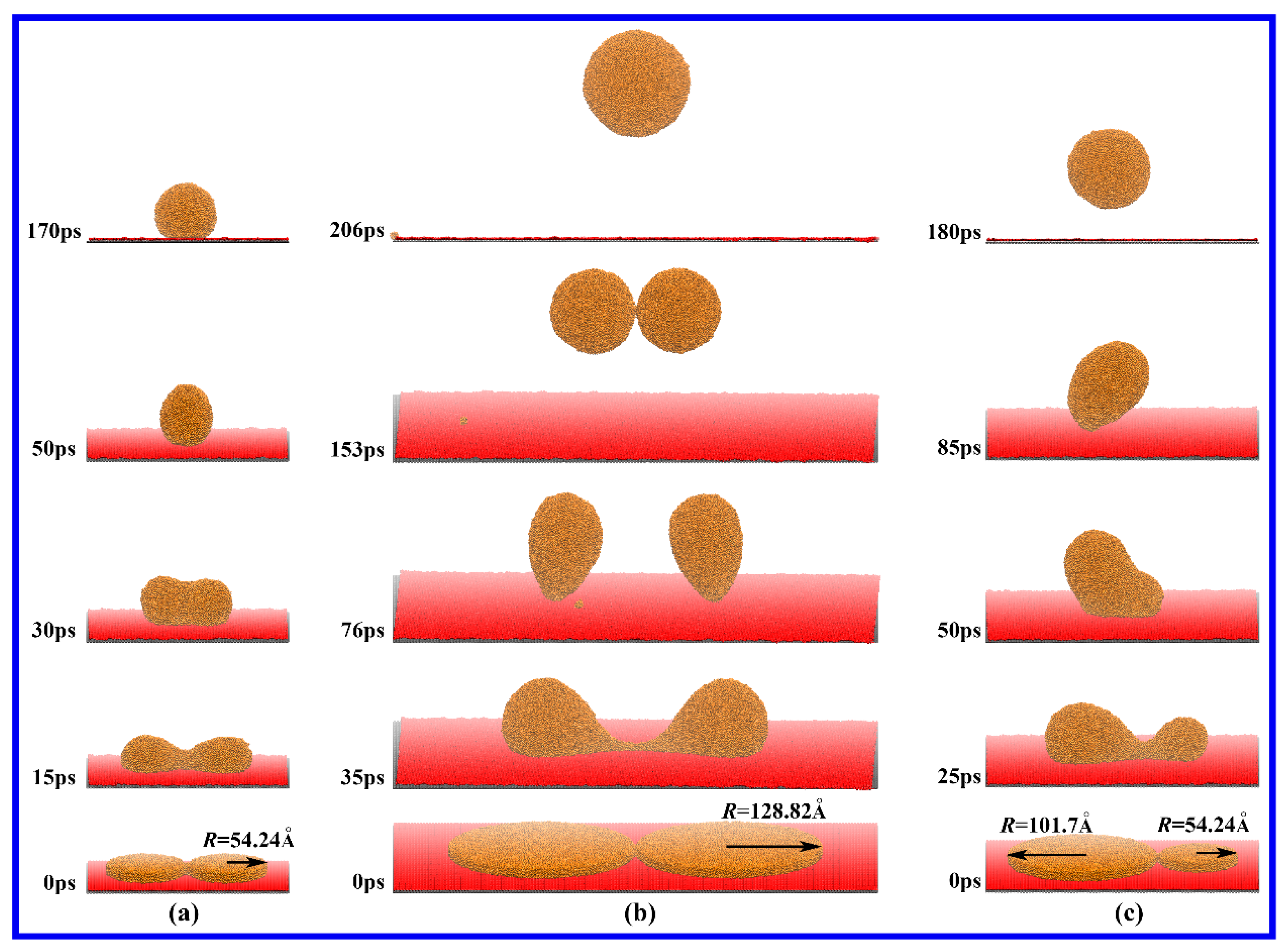 - Fuentes-Cabrera, M.; Rhodes, B.H.; Baskes, M.I.; Terrones, H.; Fowlkes, J.D.; Simpson, M.L.; Rack, P.D. Controlling the velocity of jumping nanodroplets via their initial shape and temperature. ACS Nano 2011, 5, 7130–7136. [Google Scholar] [CrossRef]