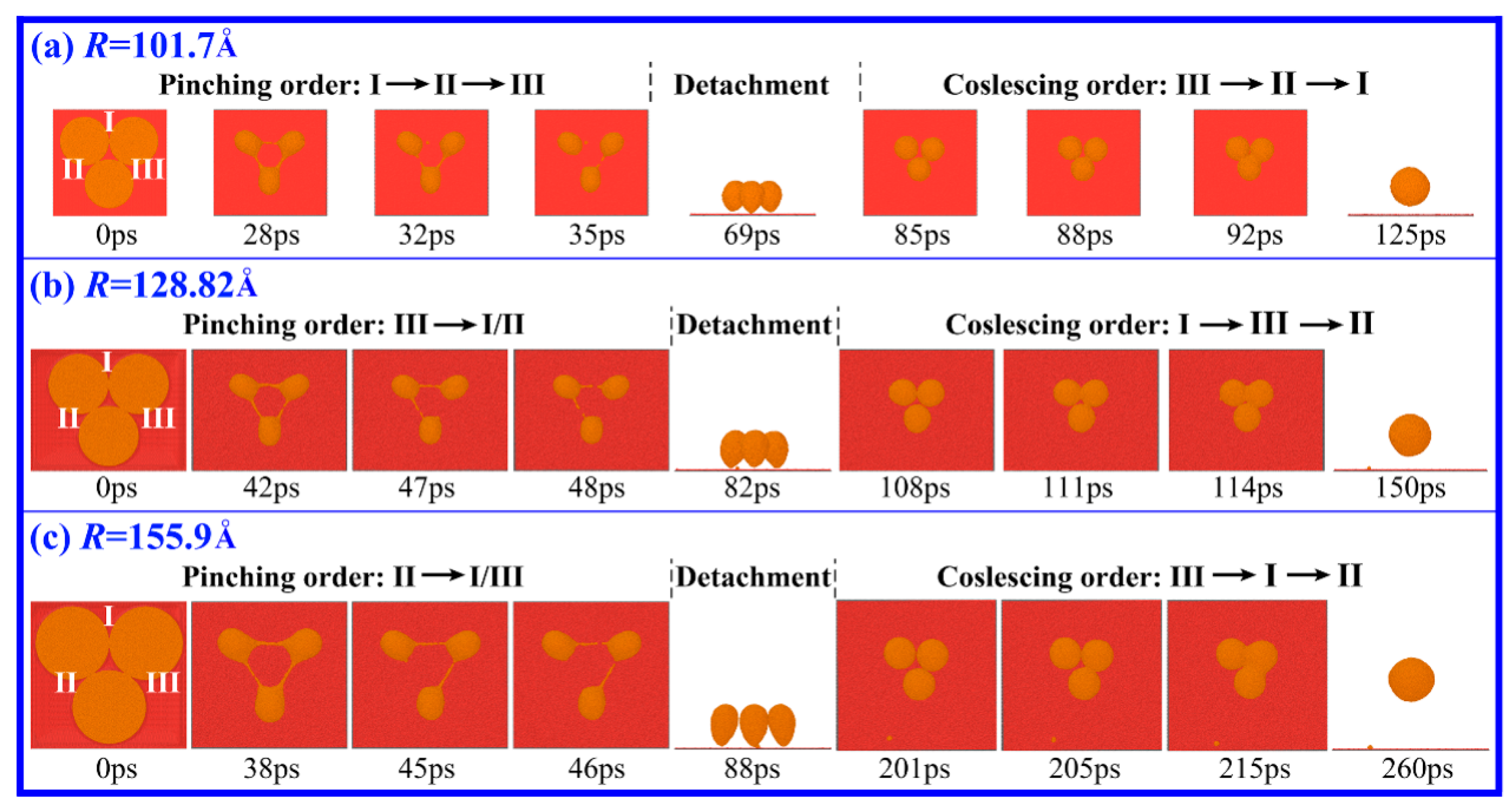 - Li, T.; Li, J.; Yan, M.; Zhang, L.; Fu, C.; Ruan, Y.; Li, H. Investigation of triple-coalescence behaviors for comprehensively understanding the structural evolution of coalesced TiAl droplets from an atomic-level view. J. Alloys Compd. 2021, 859, 157791. [Google Scholar] [CrossRef]