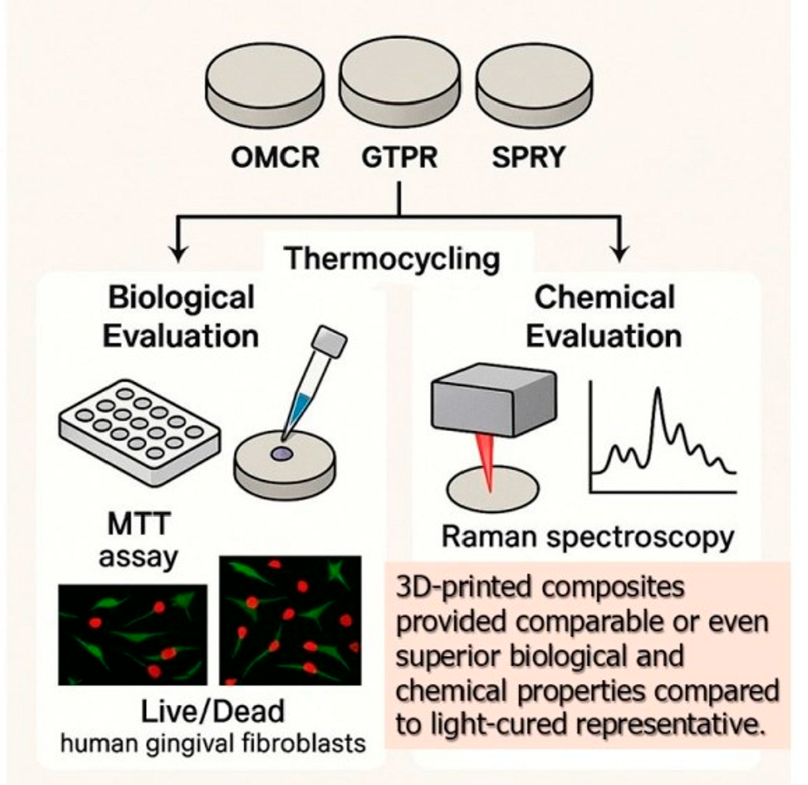 - When properly processed, 3D-printed composites can offer comparable or even superior biocompatibility and chemical integrity compared to the light-cured composite. This is likely due to optimized resin formulations and post-curing protocols that promote improved polymer network organization and reduce residual monomer release, supporting their potential for clinical application in provisional and, possibly, definitive restorative procedures.