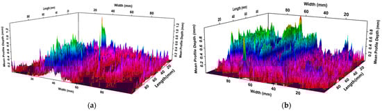The MPD is commonly used for texture structure characterization. The visual 3D topography of the MPD was obtained using Ames Texture Scanner professional software (version 3.0), as shown in Figure 5. The MPD was calculated for each coating type to provide a quantitative assessment of differences in microtexture.