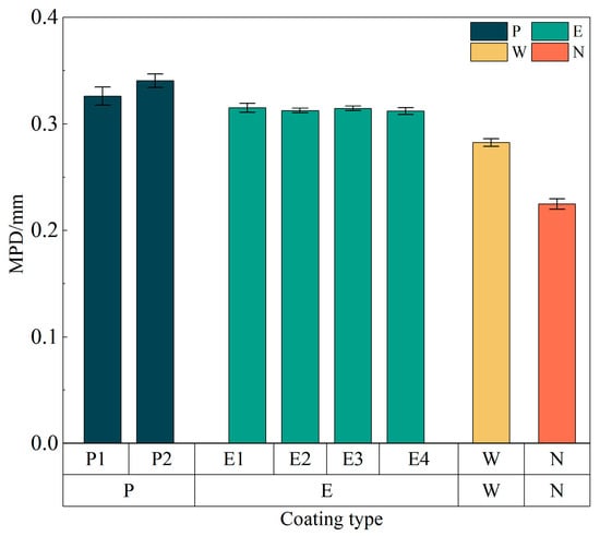 The visual 3D topography of the coatings is represented using a red-blue-green gradient, where red indicates the minimum MPD and green represents the maximum. Compared with the uncoated specimen, the coated samples exhibit a notable expansion of regions corresponding to higher MPD values, indicating an overall increase in surface microtexture. As demonstrated in Figure 6, the mean MPD values for the P, E, and W coatings increased by 43.4%, 34.7%, and 21.6%, respectively, relative to the uncoated control. Although the liquid components differed among the coatings, the microtexture distributions on the coated surfaces displayed substantial variations. Nevertheless, the consistent increase in MPD across all coatings demonstrates the significant effectiveness of the nanocoating materials in enhancing pavement skid resistance.