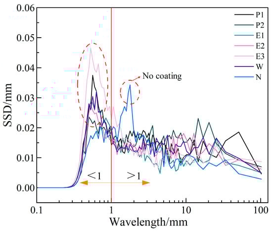 In terms of surface texture parameters for characterizing skid resistance, it is generally accepted that texture wavelengths below 1 mm are positively correlated with skid performance, with a correlation exceeding 80% []. Concurrently, the SSD provides a more accurate representation of surface texture wavelengths, and the peak SSD value corresponding to a wavelength can be regarded as the characteristic wavelength of the constructed texture within the scanned area []. Accordingly, the SSD distribution curves for each coating formulation were plotted in Figure 7 to quantitatively assess the microtextural characteristics of the coatings.