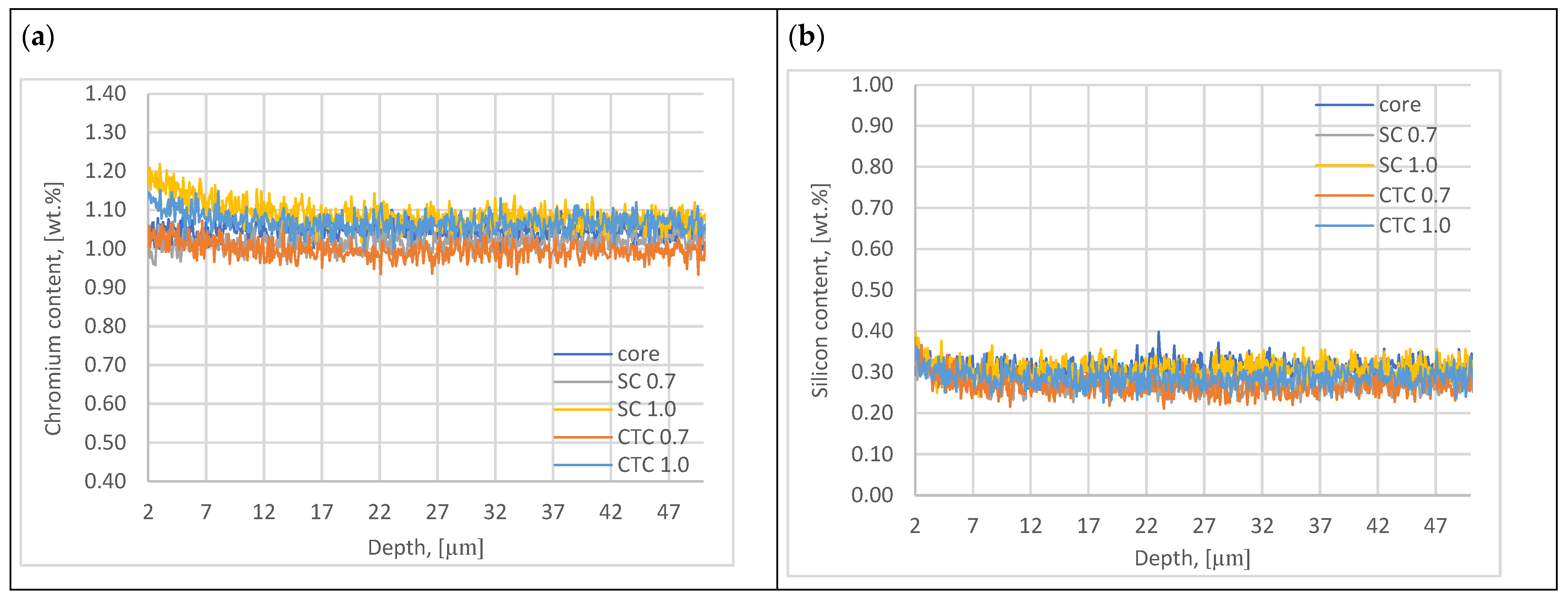 2.2. Glow Discharge Optical Emission Spectroscopy Analysis