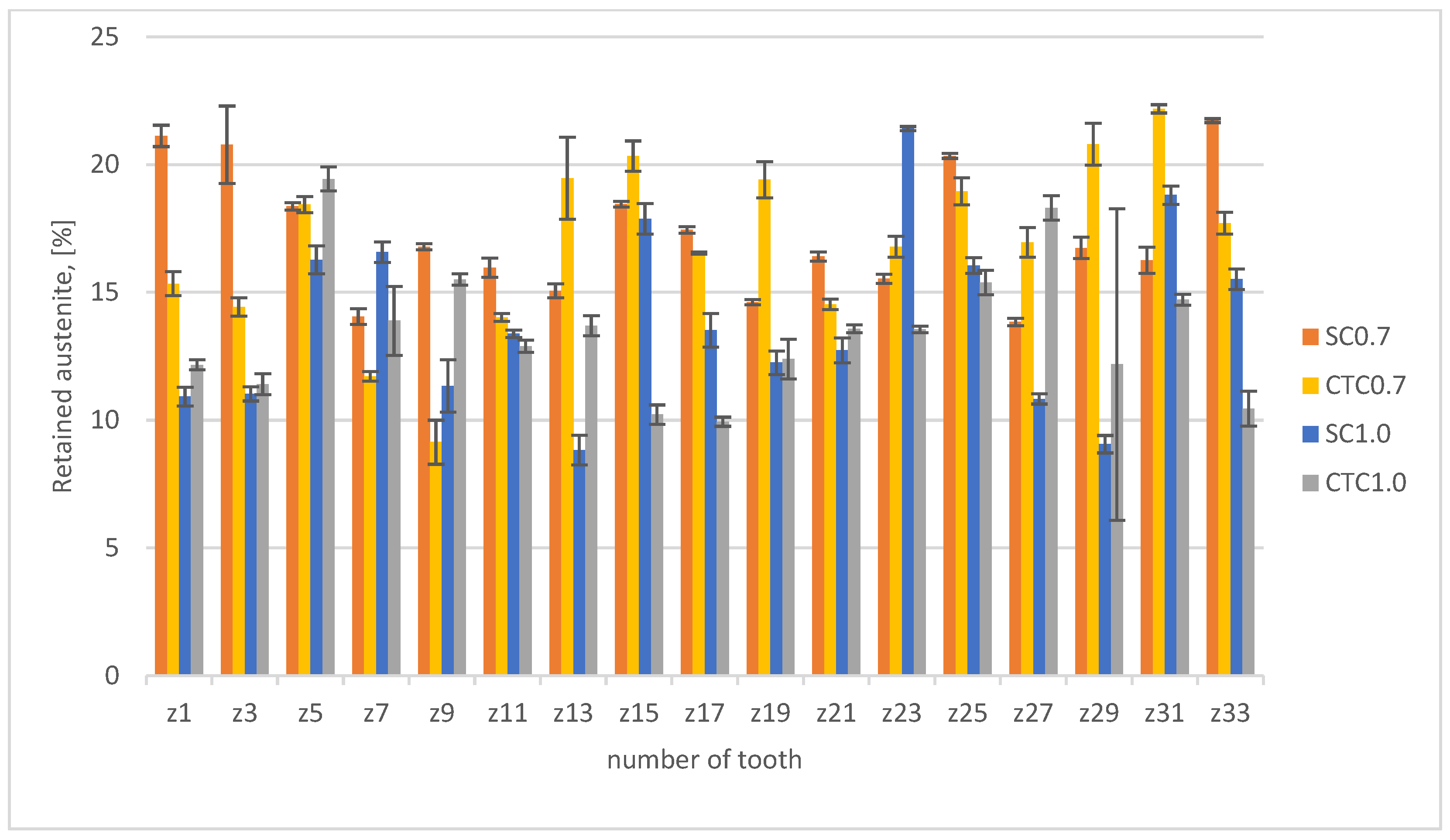- Kula, P.; Dybowski, K.; Lipa, S.; Januszewicz, B.; Pietrasik, R.; Atraszkiewicz, R.; Wołowiec, E. Effect of the Content of Retained Austenite and Grain Size on the Fatigue Bending Strength of Steels Carburized in a Low-Pressure Atmosphere. Met. Sci. Heat Treat. 2014, 56, 440–443. [Google Scholar] [CrossRef]