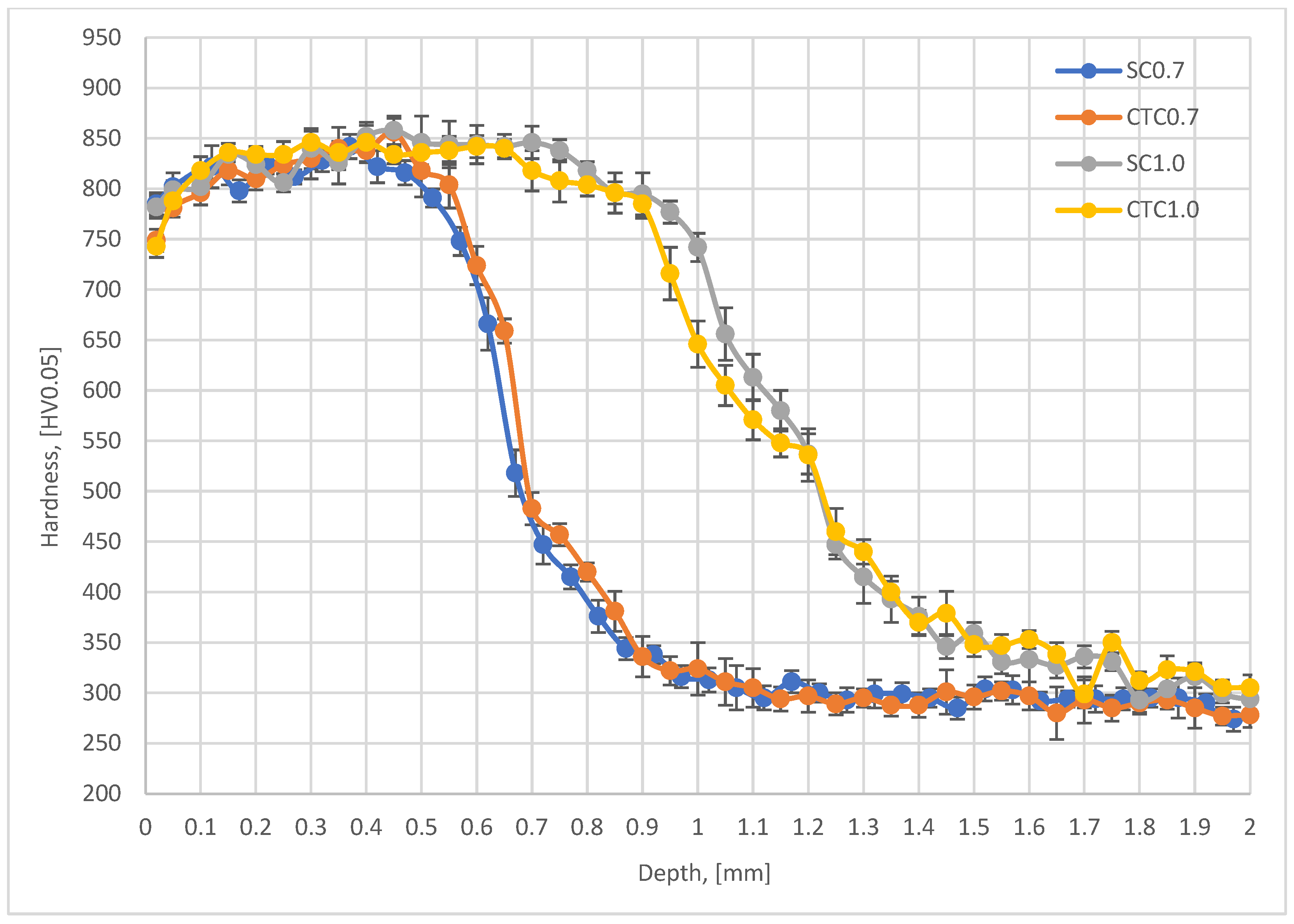 - Heintzberger, P.J. Influence of the Temperature of Vacuum Carburizing on the Thickness of the Carburized Layer and Properties of Steel Parts. Met. Sci. Heat Treat. 2020, 62, 279–284. [Google Scholar] [CrossRef]
