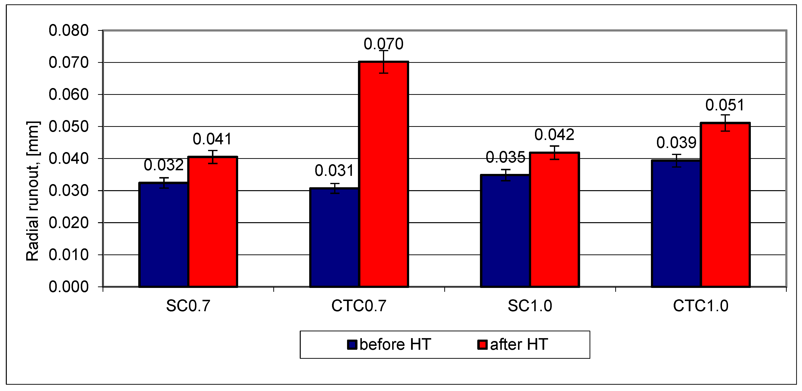 - Changes in chemical composition and their implications in phase transformation and stress studies constitute justification for the occurring geometric changes. The SC0.7 process shows the smallest geometric changes, where the smallest changes in chemical composition after the process were also observed. In relation to the process carried out at constant temperature, these changes are not very large, except for deformations concerning outer radial runout.