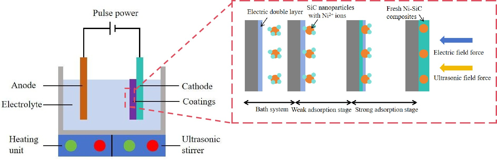 Figure 2 presents the schematic picture of an ultrasonic electrodeposition facility to fabricate Ni–SiC composites. The ultrasonic electrodeposition consisted of a pulse power generator, cathode, anode, ultrasonic stirrer, heating unit, and electrolyte. The ultrasonic stirrer was utilized to produce 60 W and 120 W ultrasonic power for producing Ni–SiC composites. Meanwhile, the Ni–SiC composites manufactured without ultrasonic agitation were defined as 0 W. The heating unit was used to maintain the electrolyte temperature at 48 °C for deposition. The specific chemical components of electrolyte for producing Ni–SiC composites are displayed in Table 1. All of the chemical agents used were of analytical grade.