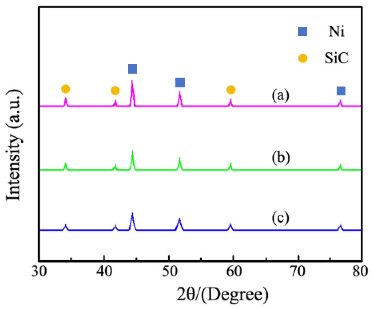 Figure 7. XRD spectrum of Ni–SiC composites prepared at various ultrasonic powers: (a) 0 W, (b) 60 W and (c) 120 W.
