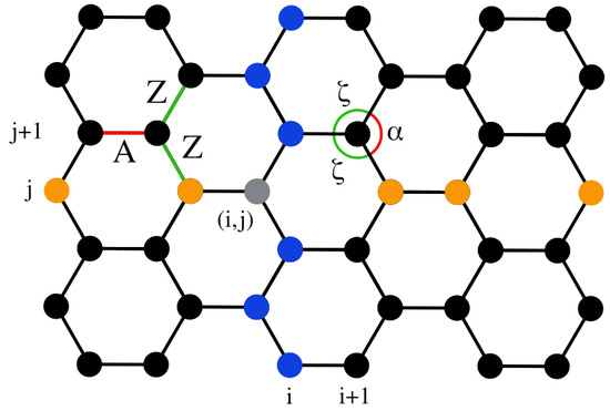 A schematic of the hexagonal graphene lattice depicting atoms, arranged in columns and rows. Atoms in column i and row j are indicated in blue and orange, respectively, and the th atom is in gray. The A- and Z-type bonds, and similarly the - and -type angles, are indicated in red and green, respectively (see Section 3.3 for more details on these distinctions).