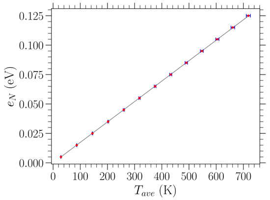 Red dots represent the relation between the additional energy density above the relaxed K graphene structure subjected to uniaxial tensile stress eV/Å2 in the zigzag direction and the average temperature at thermal equilibrium, evaluated through the MD simulations by averaging over both time and the different realizations. One standard deviation of the measurements is indicated by blue horizontal error bars. The linear fitting of the presented data points is indicated by the gray solid line, providing a slope equal to eV/K.