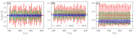 In Figure 3, we highlight the behavior of for various values of stress in the zigzag direction at three distinct temperatures T, which are indicated by different colors. An increase in temperature leads to an increase in the amplitude of strain oscillations as well as in the average strain. The latter is obtained as the average over both realizations and time, , and it is indicated by the dashed horizontal lines of different colors depending on the temperature in Figure 3. The average strains (red horizontal dashed lines) about which the K curves oscillate are higher than the (blue horizontal dashed lines) of the K curves in all cases of different stress. However, these differences are larger for absolute values for larger stresses.
