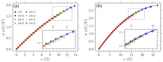 Stress–strain response of planar graphene for uniaxial loads in the (a) armchair and (b) zigzag directions for different temperatures as indicated in the legend. Filled circles indicate the obtained average strain for each given stress. Solid curves represent fittings of these data with Equation (7) (see text). For K, the strain is given as the average over time and realizations, , and the error bars correspond to one standard deviation. The insets in each panel depict a close-up view of the region indicated by the gray rectangle in each panel.