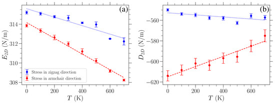 The Young’s modulus (Figure 5a) appears to decrease almost linearly with an increasing temperature, albeit only by a relatively small amount, which is consistent with other results in the literature [7,33,41]. In particular, the linear fitting of these data for stress in the armchair direction leads to a variation in with a slope of (N/m)/K, while for stress in the zigzag direction, the slope is (N/m)/K.