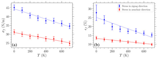Finally, we estimate the graphene’s fracture strength and failure strain for different temperatures T. The former is obtained by using the highest tested value of stress that does not lead to failure of the graphene sheet. Its error bar is provided by the step we used when increasing the tested values, which are evenly spaced. These results are presented in Figure 6a, where an almost linear decrease in fracture stress with temperature is shown. A linear fitting of these data points is indicated with a dashed red (dotted blue) line for stress in the armchair (zigzag) direction. The slope of the linear fitting of the data is (N/m)/K for stress in the armchair direction and (N/m)/K for stress in the zigzag direction.