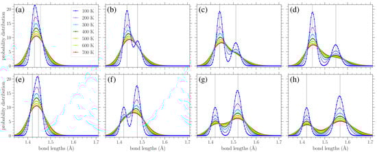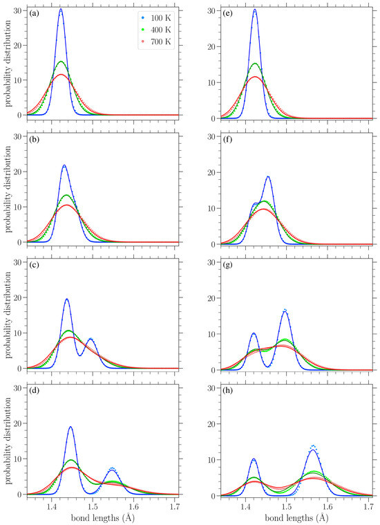 In Figure 7a–d, we show the normalized bond length distributions for increasing values of stress applied in the armchair direction. In Figure 7e–h, the applied load is in the zigzag direction, and the stress increases from (e) to (h) too. When there is no loading, i.e., , at finite temperatures, the distributions are simply normal distributions with the variance linearly increasing with temperature (see Section 3.3.1). Increased temperature leads to larger fluctuations in the lattice, resulting in a wider spread of the observed bond lengths. In the presence of uniaxial loading, for the smaller values of stress presented in Figure 7a,e, there is a slight skewing of the distributions. As the stress is increased, the single peak splits into two peaks that are gradually separated more and more, as can be clearly seen from the plots corresponding to lower temperatures, due to the increased separation of the A and Z bond length values (see Figures 2 and 3 in Reference [42]). However, the increase in temperature leads to the merging of these two peaks due to their broadening. The centers of the peaks correspond to the zero-temperature values of the two types of bond lengths for each different direction of the applied stress, as given in Equations (8), (9), (12) and (13).