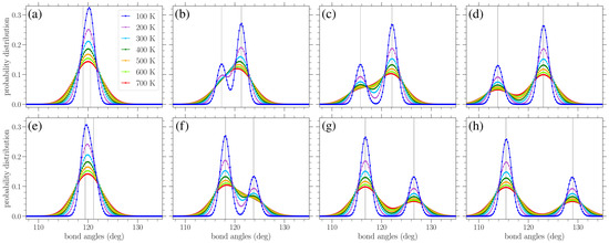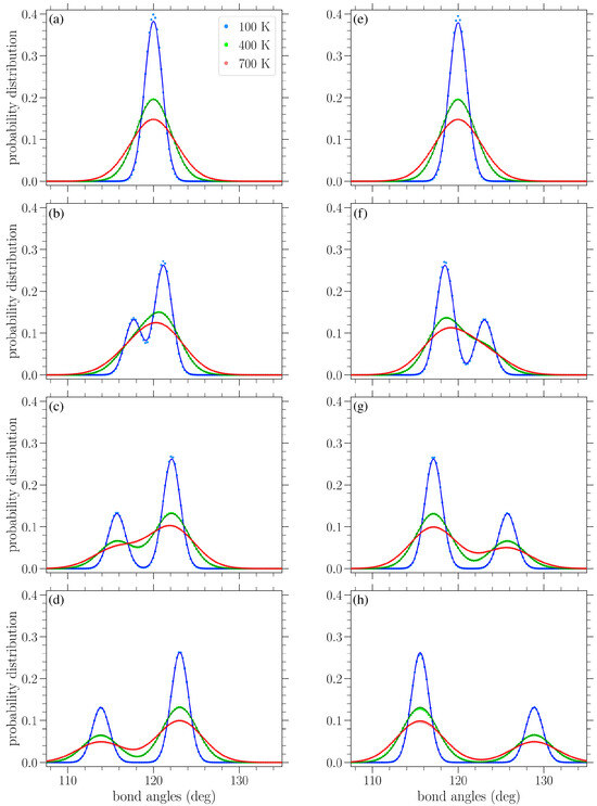 In Figure 8, results similar to those given in Figure 7 are presented, but for the distribution of bond angles. At zero strain, normal distributions centered about the equilibrium angle of were obtained for finite temperatures, with a variance increasing with temperature (see Figure 9b below). Again, we see the gradual peak splitting due to increased stress, while increasing the temperature leads to the broadening and merging of these peaks. The highest peak in the bond angle distributions corresponds to the -type angles, since there are twice as many angles as angles. For stress in the armchair direction (Figure 8a–d), the angles decrease, while the angles increase. The reverse is true when the stress is applied in the zigzag direction (Figure 8e–h). Also, in this case, the peaks of the distributions are centered about the zero-temperature and values, as given in Equations (10) and (11) or (14) and (15), depending on the direction of the applied stress.