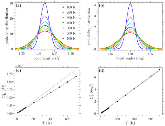 As there exist approximate expressions for the equilibrium bond lengths and bond angles as a function of the applied strain at K (see Equations (8)–(15)), the explicit dependence of variance on temperature remains to be determined. This will be achieved by numerically evaluating the effects of temperature on the normal distributions of the bond lengths and bond angles for the unstrained graphene sheet. The results of these calculations will be compared with analytical estimates of the variance through the Boltzmann distribution, using a second-order approximation on the relevant potential energy terms describing bond stretching and angle bending.