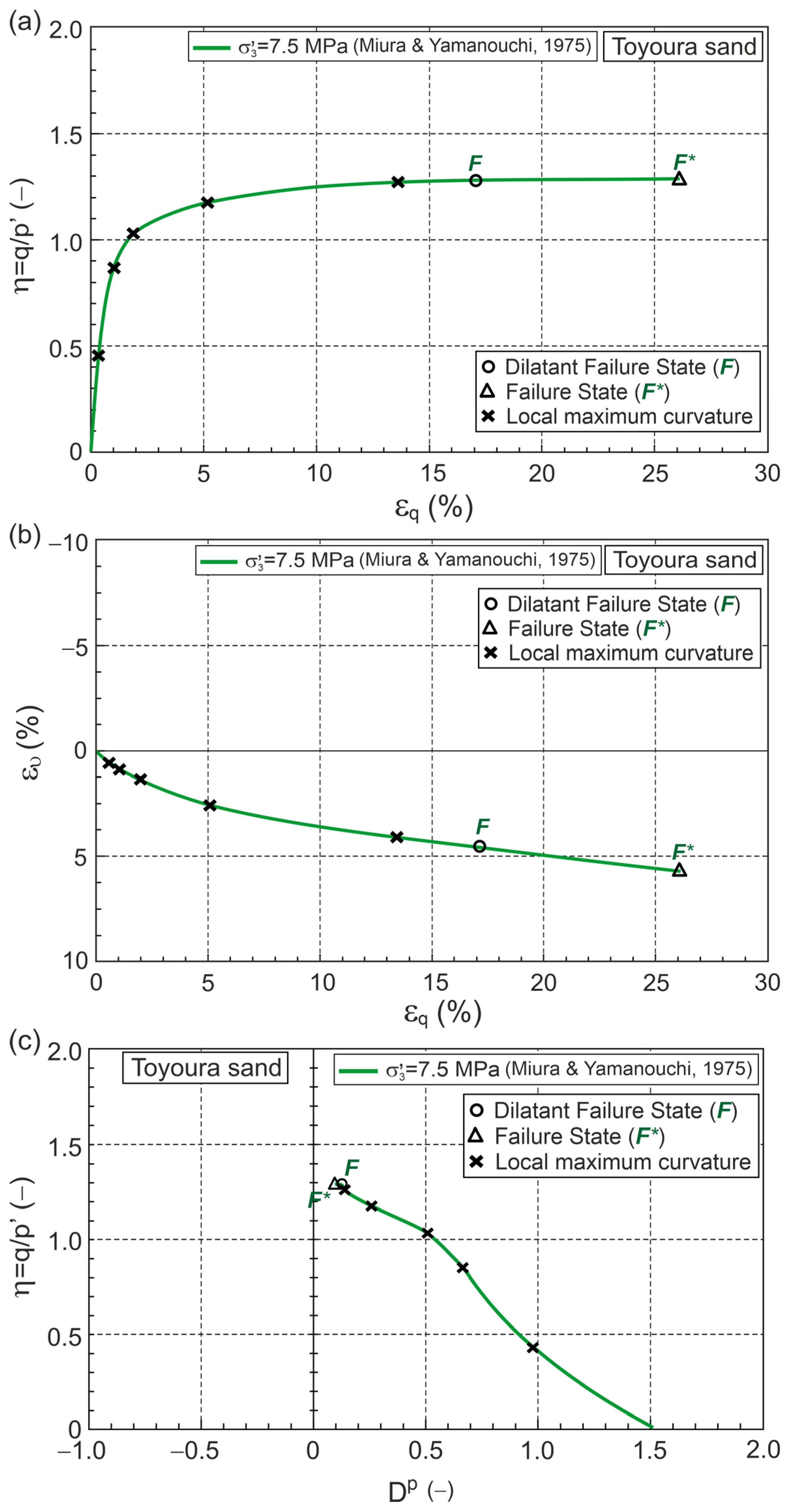 for a conventional drained triaxial compression test on Toyoura sand, performed by Miura and Yamanouchi [