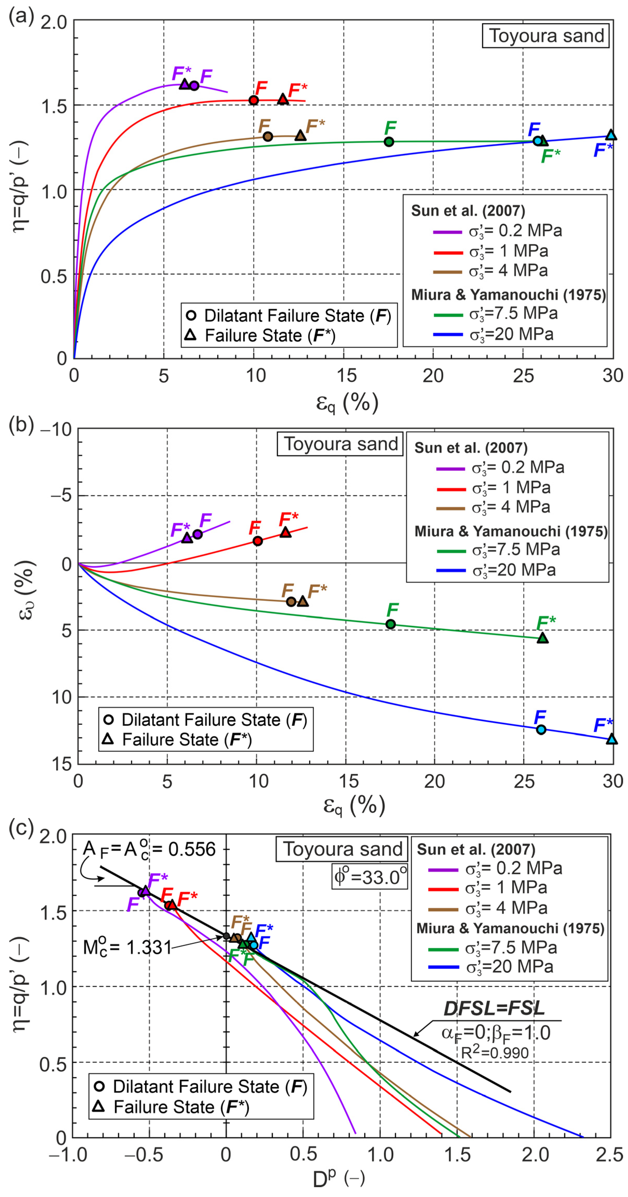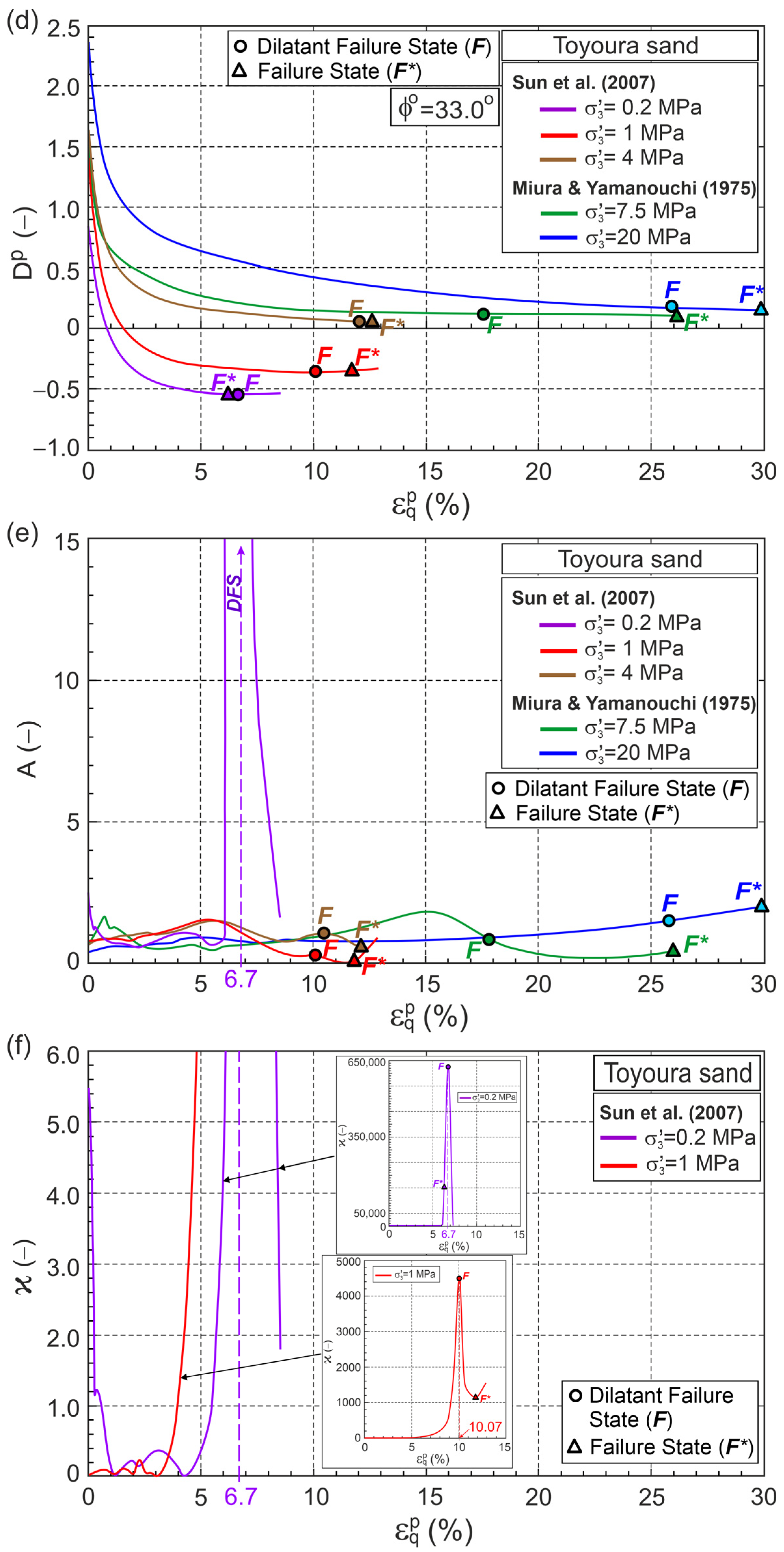 Toyoura sand | Sun et al. (2007) [31] | 0.680 | 200 | - | 1.331 | 0 | 1.000 | 1.614 | −0.543 | 6.70 | 1.620 | −0.541 | 6.10 | 25.0 | - | 0.3 |