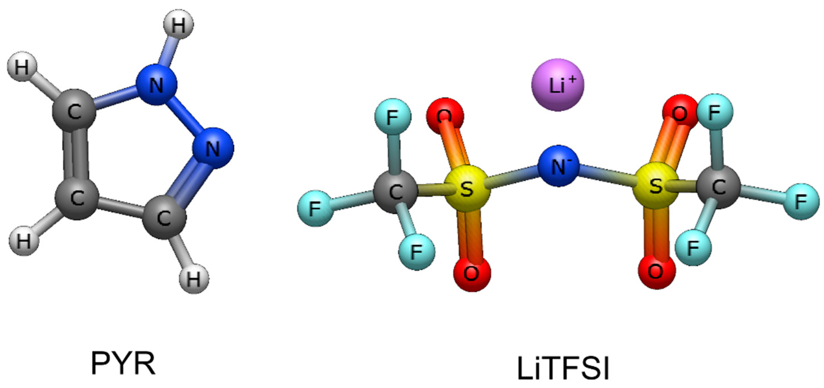 - Wettstein, A.; Diddens, D.; Heuer, A. Controlling Li+ Transport in Ionic Liquid Electrolytes through Salt Content and Anion Asymmetry: A Mechanistic Understanding Gained from Molecular Dynamics Simulations. Phys. Chem. Chem. Phys. 2022, 24, 6072–6086. [Google Scholar] [CrossRef]