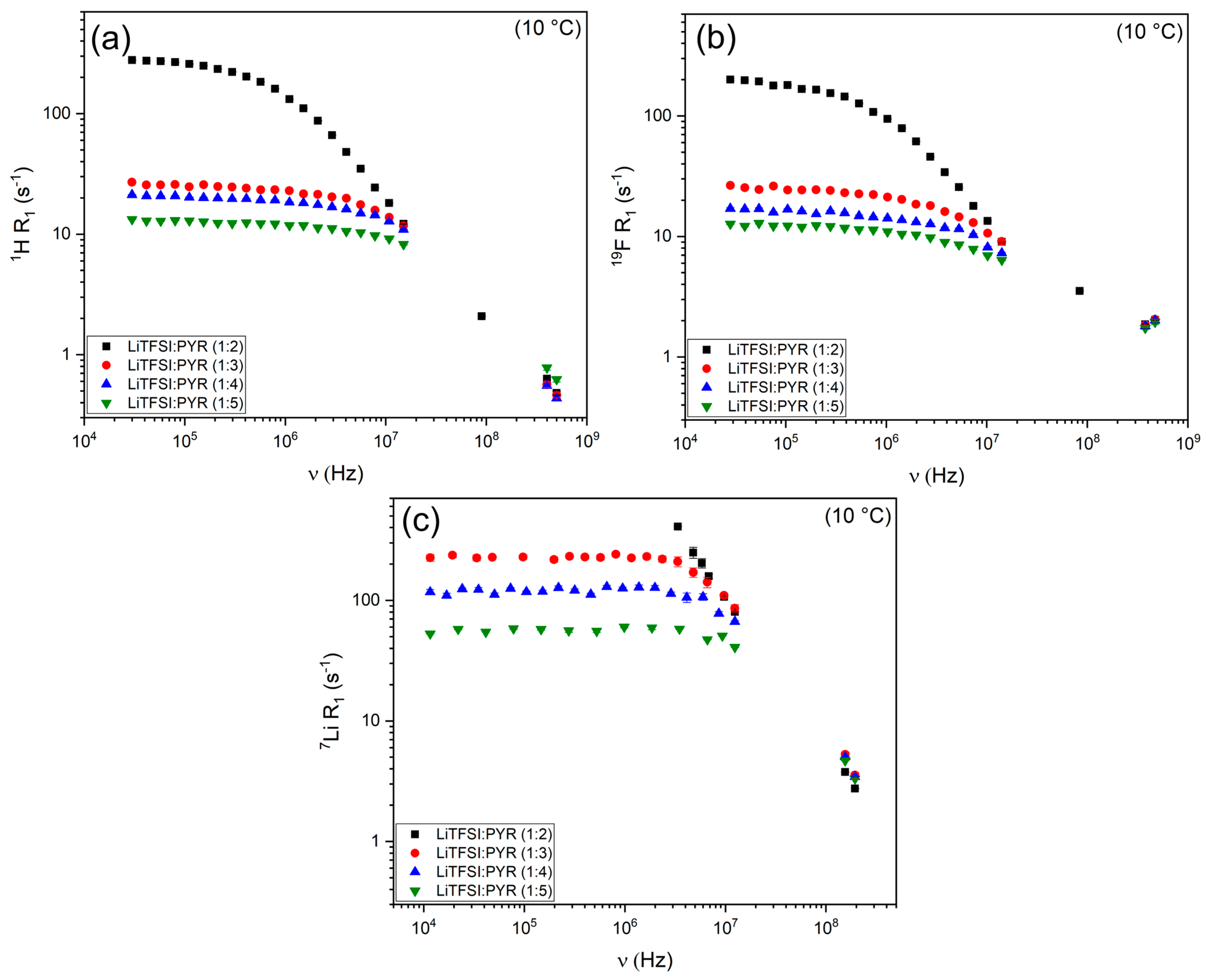 - de Araujo Lima e Souza, G.; Brandwein, E.; Pelegano-Titmuss, E.; Stallworth, P.; Zhang, Y.; Oliveira Sebastião, P.J.; Greenbaum, S. Expanded View of NMR Spin–Lattice Relaxation in Fluorine-Containing Ionic Liquids. J. Phys. Chem. Lett. 2025, 16, 7622–7629. [Google Scholar] [CrossRef]