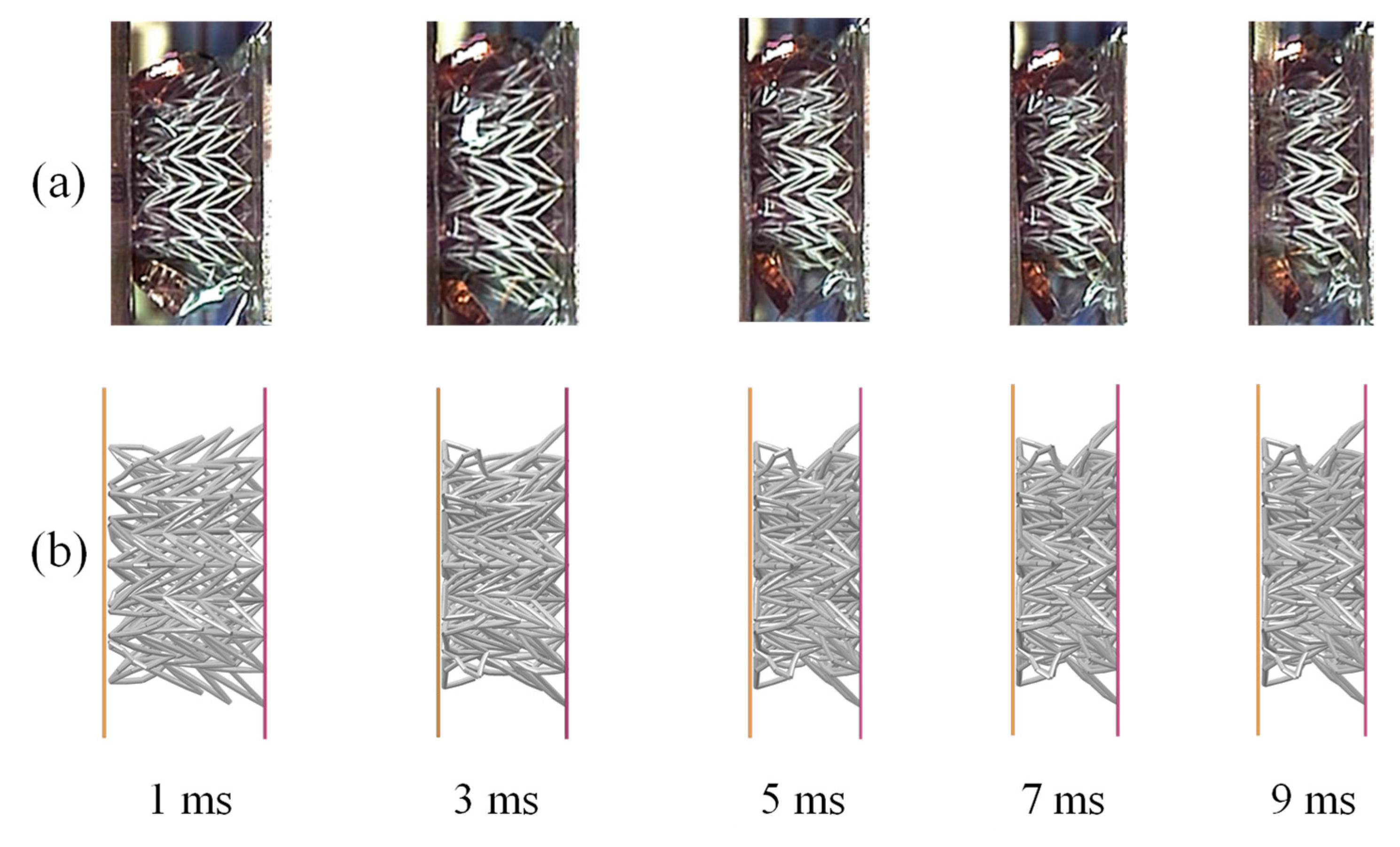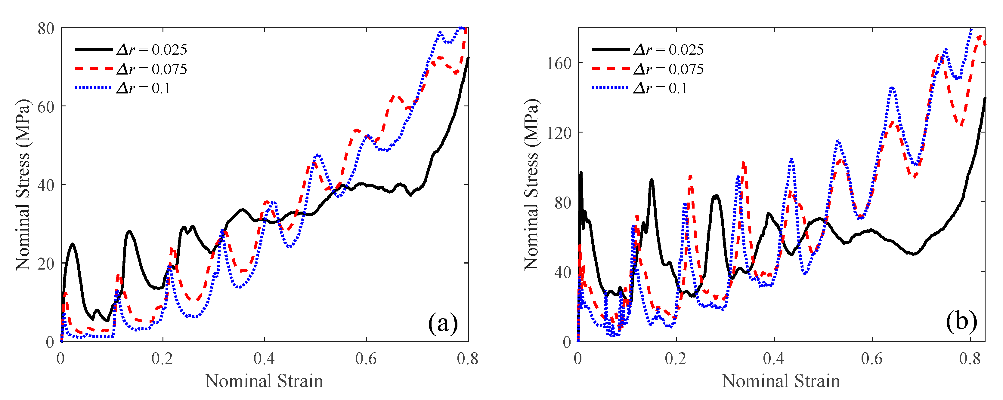 - Qiu, X.; Zhang, J.; Yu, T. Collapse of periodic planar lattices under uniaxial compression, part II: Dynamic crushing based on finite element simulation. Int. J. Impact Eng. 2009, 36, 1231–1241. [Google Scholar] [CrossRef]