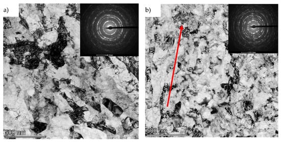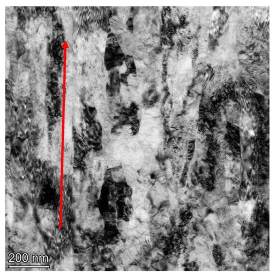 On the cross-section, we observe a defected microstructure with well-formed grains. This is also evidenced by the very distinct rings observed in the SAED images. The average grain size as measured by image analysis is deq = 74 nm (±20) with a coefficient of variation of grain size distribution (Cvdeq) = 0.25. The almost twofold lower value of Cvdeq compared to titanium after extrusion in this case indicates a much higher microstructural homogeneity. In contrast to the microstructure images presented for the longitudinal section, after the hydrostatic extrusion process, a well-developed grain microstructure is also observed on the longitudinal section after the combination of the ECAP and HE processes. SAED images in this case also show well-formed rings from multiple orientations. The average grain size on the longitudinal section is deq = 95 nm (±35) with the coefficient of variation of the grain size distribution (Cvdeq) = 0.35 and is similar in error to the value measured on the transverse section. The higher value of the coefficient of variation of the Cvdeq distribution and the slightly larger average grain size (deq) compared to the cross-section is due to the still locally present bands and grains oriented according to the extrusion direction; however, these bands are shorter and clearly interspersed with fine grains. An example of such an area is shown in Figure 11.