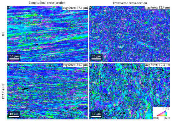 Inverse pole figure (IPF) maps of TiGr2 microstructure after hydrostatic extrusion (HE) (a,b) and combined ECAP + HE (c,d) processing. IPF coloring corresponds to the extrusion direction. HAGBs are indicated by black lines, and LAGBs are indicated by grey lines.