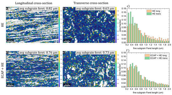 Fine subgrain analysis in titanium processed by hydrostatic extrusion (a–c) and in titanium processed by combined ECAP + HE (d–f). Maps present the subgrain size distribution of subgrains with lengths below a 2 µm threshold. White areas represent the coarse subgrain fraction (above 2 µm length).
