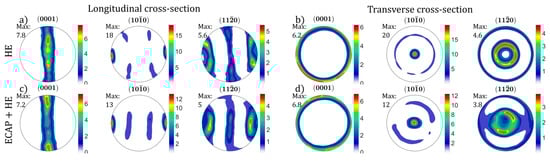 Figure 15 shows the pole figure plots related to the presented EBSD maps. The pole figures calculated from the EBSD orientation data indicate a strong axial texture typical for hcp metal products after axisymmetric plastic deformation process. In both cases, HE and combined ECAP + HE processing results in strong preference of () poles alignment with the extrusion direction, and (0001) poles are distributed radially in plane perpendicular to the extrusion direction (Figure 15b,d). However as indicated by maximum intensities in the () PF maximum along the extrusion direction, the texture after combined ECAP + HE processing is substantially softened, as evidenced by a decrease in the () PF peak intensity from 20 multiples of random (rdm) to 12 rdm.