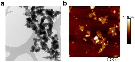 (a) TEM image (scale bar: 100 nm) and (b) AFM image (scale bar: 410 nm) of GW Nfs.