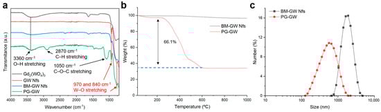(a) FTIR spectra of bulk Gd2(WO4)3 (black line), GW Nfs (red line), BM-GW Nfs (blue line), and PG-GW (green line). (b) TGA profile of BM-GW Nfs (black) and PG-GW (red) measured in a nitrogen atmosphere. (c) DLS profiles (number mode) of BM-GW Nfs and PG-GW dispersed in Milli-Q water.