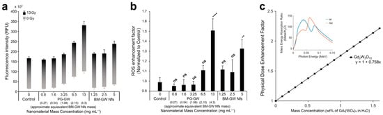 Given the presence of two high-Z elements (Gd and W), the radiosensitizing potential of BM-GW Nfs and PG-GW was evaluated through X-ray irradiation experiments and dose enhancement calculations. The high photon interaction cross section of the BM-GW Nfs and PG-GW with kilovoltage X-rays (kV X-rays) leads to secondary electron emission, especially of photo- and Auger electrons []. These electrons facilitate the generation of reactive oxygen species (ROS), especially hydroxyl radicals, from the water molecules within ~200 nm of the nanomaterials. ROS generation efficiency during X-ray irradiation was assessed using the 2’,7’-dichlorofluorescein (DCF) assay []. Irradiation without materials led to an increase in ROS levels as indicated by the increase in DCF fluorescence intensity after 13 Gy X-ray treatment (control in Figure 4a). Compared to the control, the BM-GW Nfs and PG-GW led to a material dose-dependent increase in DCF fluorescence, or ROS generation, at a concentration of ≥1.25 mg mL−1 of BM-GW Nfs (Figure 4b) [,]. However, statistical analysis (one-way ANOVA followed by Tukey’s post hoc test) revealed that only the highest concentrations of PG-GW (13 mg mL−1) and BM-GW Nfs (5 mg mL−1) showed statistically significant enhancement over the control. While the low-dose groups did not reach statistical significance, the overall trend is suggestive of a dose-dependent response. Therefore, linear regression was applied to explore the strength of the correlation (Figure S4), with the understanding that this does not imply significance at each point. Although a higher ROS signal for PG-GW compared to that for BM-GW Nfs was observed at the highest concentration, 13 mg mL−1, the regression trend nevertheless indicated that PG-GW exhibited greater ROS enhancement than BM-GW Nfs (Figure S4). This is likely due to the difference in hydrodynamic sizes between BM-GW Nfs and PG-GW []. The hydrodynamic diameter decreased from 1884.8 nm (BM-GW Nfs) to 568.3 nm (PG-GW), while the mass-normalized ROS-enhancement slope increased from 0.609 to 0.953. Compared to the theoretical DEF of 0.758 (Figure 4c, detailed in Section 2), the BM-GW Nfs showed a slightly lower level, while that for PG-GW was slightly higher. This inverse trend suggests that aggregation in BM-GW Nfs limited dose enhancement, whereas PG-GW indicated smaller size and better dispersibility, enabling greater ROS generation per mass. However, homogeneous dispersion may not fully explain the value exceeding the theoretical DEF. A likely additional factor is the larger specific surface area of PG-GW, which could enhance ROS generation beyond DEF predictions. In comparison, TiO2 or WO3 nanoparticles [,] can yield ROS enhancements 10–100 times higher than the theoretical DEF through surface charge transfer catalysis. By contrast, the ROS enhancement of PG-GW showed only a 1.2-fold increase, indicating that secondary-electron mediation is the dominant mechanism. To assess radiosensitizing performance, the ROS enhancement factor of PG-GW was compared with that of previously reported Gd-based nanoparticles. Activation and Guidance of Irradiation by X-rays (AGuIX) showed enhancement factors ranging from 1.1 to 2.5, and Gd2O3@SiO2 exhibited a value of approximately 1.83 at a Gd concentration of 48 µg mL−1 [,]. At the same Gd concentration in the PG-GW system (0.16 wt%), the ROS enhancement factor was estimated to be 1.2 based on the regression trend in Figure S4. This factor is the lower range of the above values reported for AGuIX. While this does not reflect a statistically validated enhancement at that specific concentration, it suggests that PG-GW may offer comparable radiosensitization potential at similar Gd concentrations.