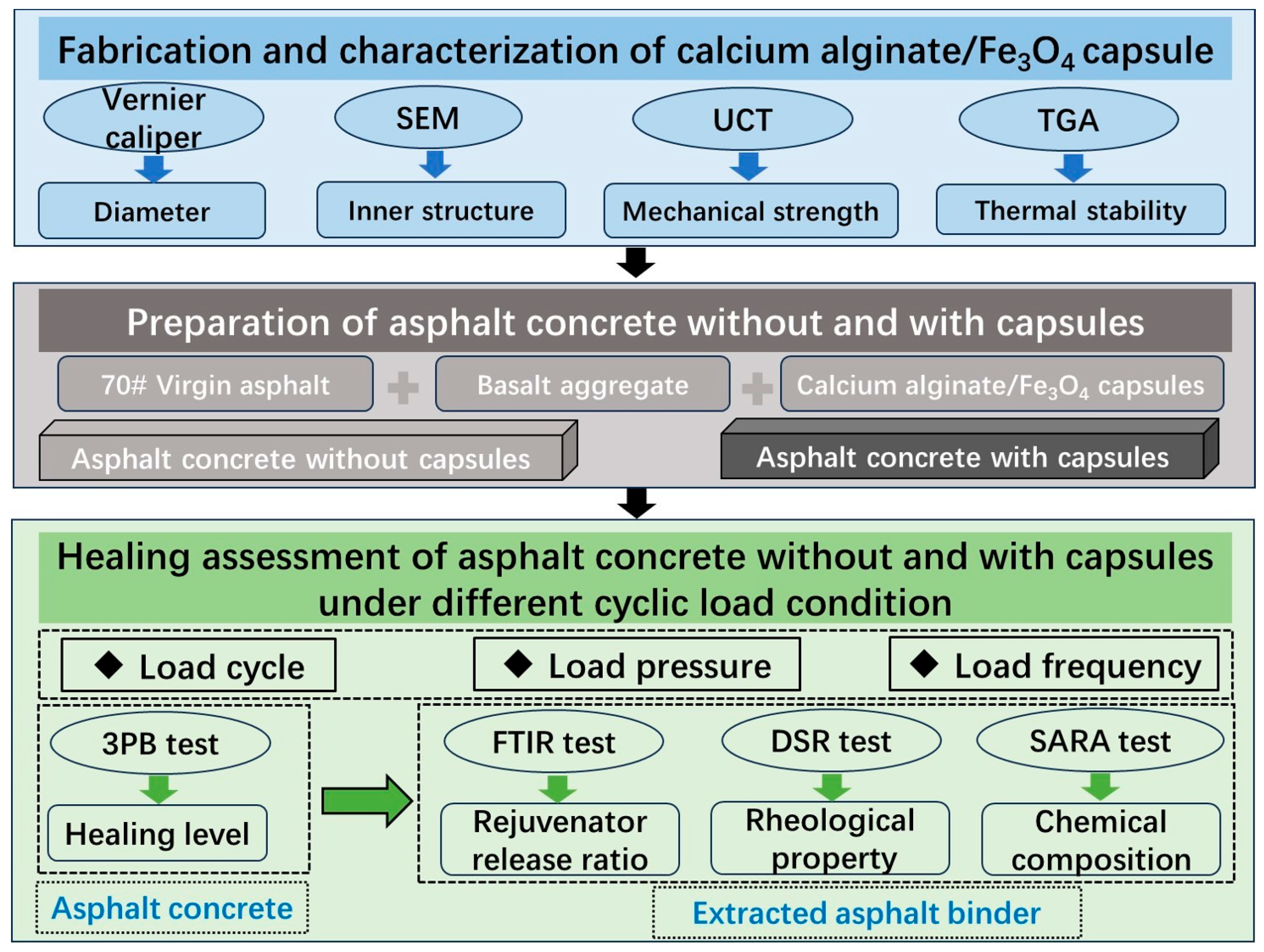 Therefore, this study evaluates the healing properties of asphalt concrete with calcium alginate capsules under varying load patterns, including load cycles, pressure, and frequency. The calcium alginate/Fe3O4 capsules are synthesized in this work, and their key material properties are systematically evaluated. The healing efficiency of capsule-modified asphalt under various load conditions is evaluated via a fracture–healing–refracture protocol. The rejuvenator release ratio is quantified using FTIR, while the rheological and chemical properties of the extracted binder are assessed via DSR and TLC-FID, respectively. The whole research flowchart is presented in Figure 1.