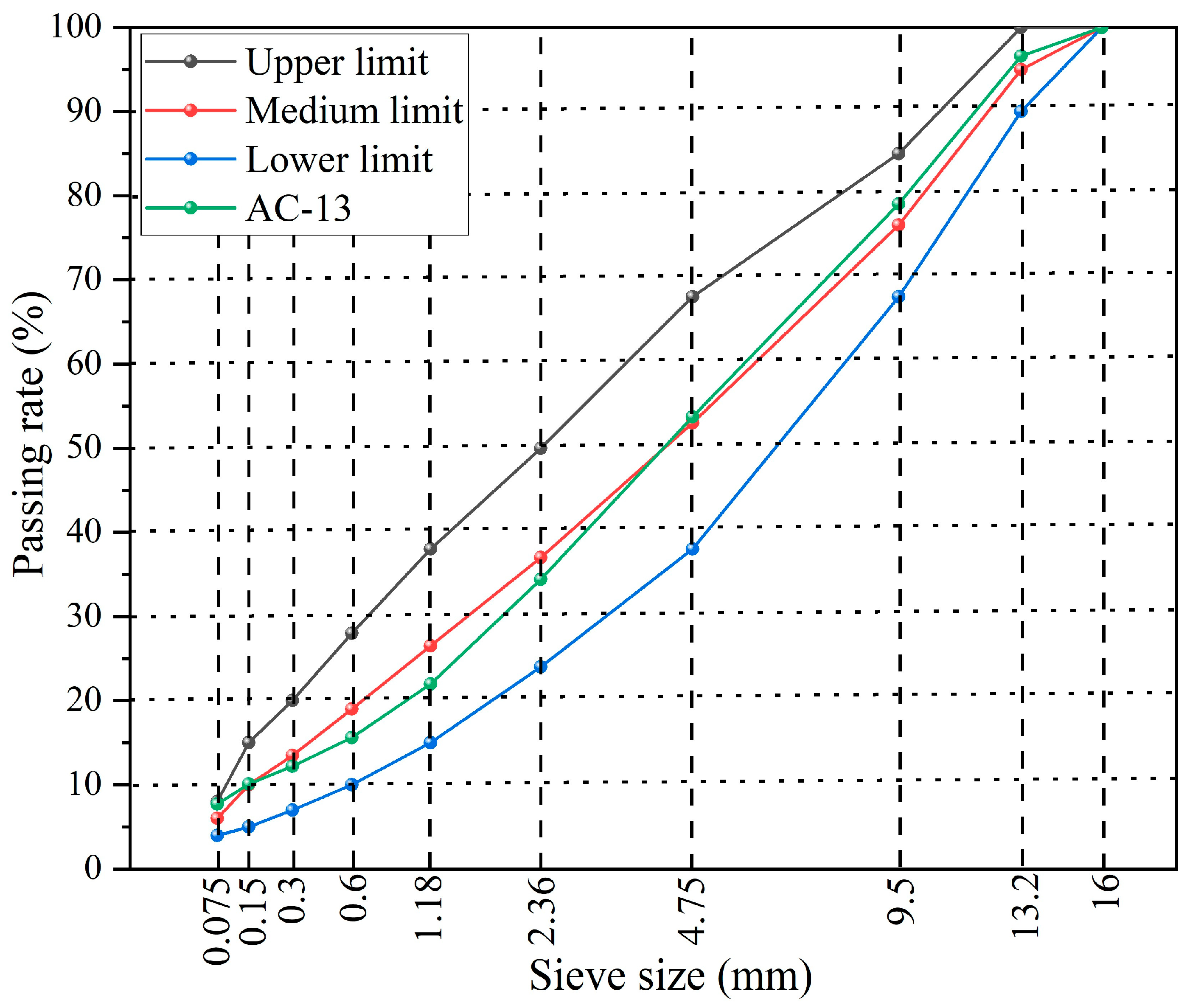 In this study, a dense-graded AC-13 asphalt mixture is utilized, with its gradation provided in Figure 3. The capsules are incorporated into the mixtures at an optimum content of 0.5% by mass during mixing. Subsequently, asphalt concrete plates, both with and without capsules, are produced using a rutting plate compactor. The asphalt concrete beams measuring 98 mm × 45 mm × 50 mm are extracted. A notch of 5 mm × 4 mm is carefully created in the center of each beam.
