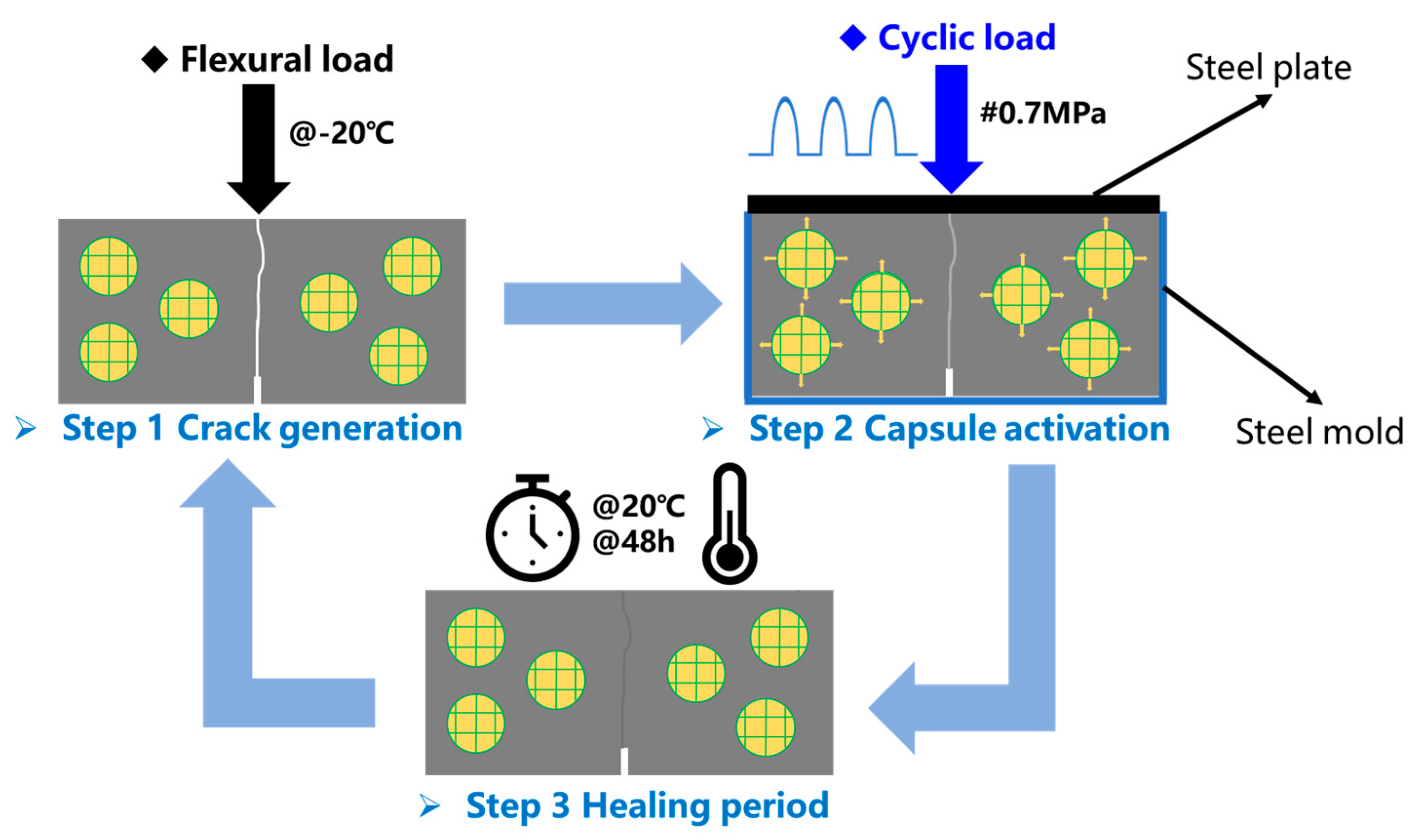 A fracture–cyclic load–healing–refracture procedure is performed on normal asphalt concrete beams and capsules modified beams, following the four-step process illustrated in Figure 4. Initially, a three-point bending (3 PB) test is carried out at −20 °C with a load rate of 0.5 mm/min to introduce cracking and determine the initial flexural strength. Subsequently, the cracked beams are placed into a steel mold covered with a steel plate and then subjected to cyclic load to apply uniform compressive stress. Afterward, the beams are transferred to a temperature-controlled chamber and healed at 20 °C for 48 h. Finally, a second 3 PB test is conducted on the healed beams under the same conditions to evaluate their recovered strength. Each experimental group is replicated three times in parallel. The average of the three trial results was taken as the final experimental result.