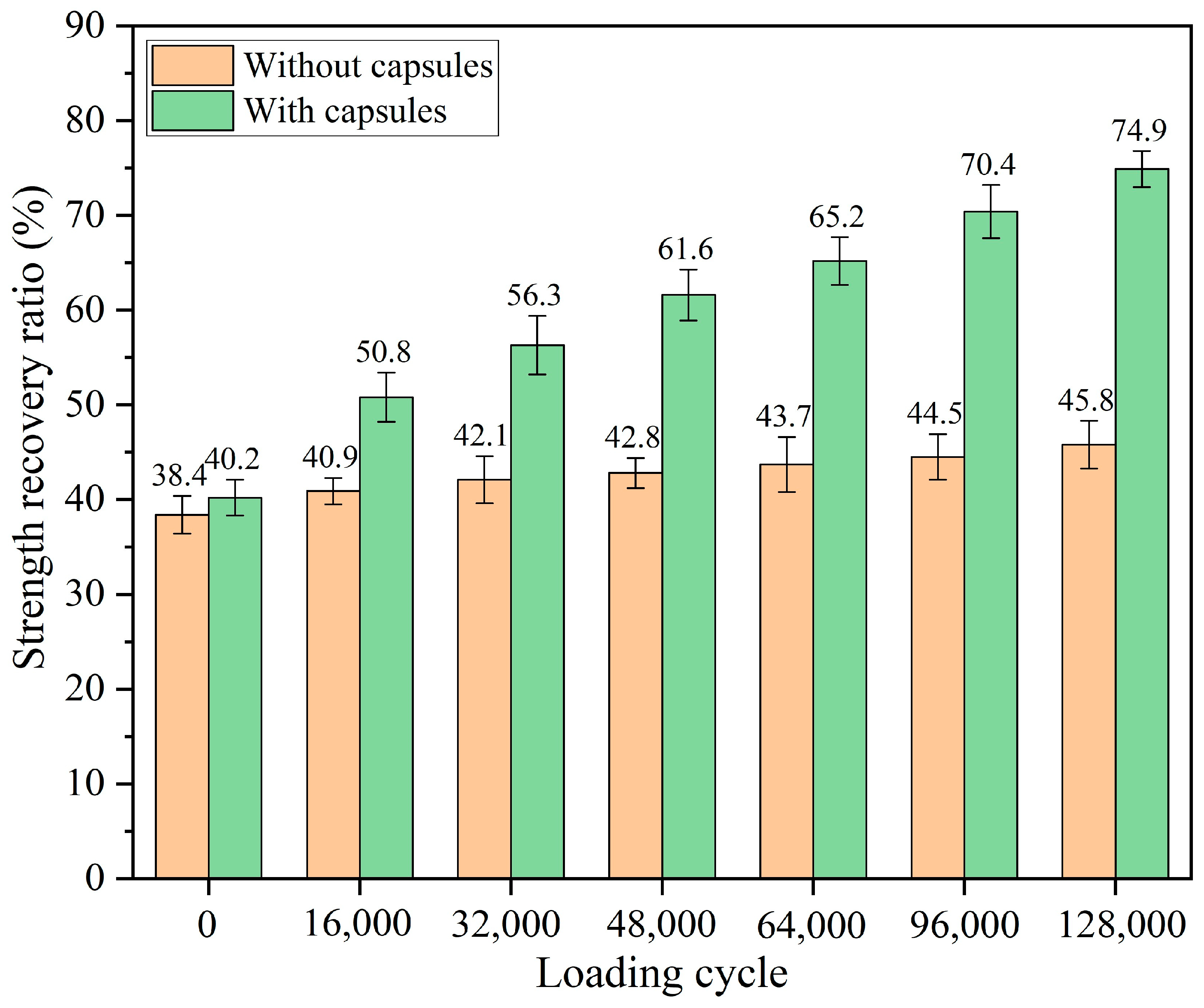 The healing capacity of capsule-modified beams is markedly superior to that of ordinary beams under identical cyclic load, thus confirming that capsule incorporation can substantially improve the self-healing performance of asphalt concrete. An improvement in the healing level is observed in the beams containing capsules as the load cycles increase. On the one hand, the intrinsic repair characteristics of asphalt itself and the denser asphalt concrete in the process of cyclic load application are beneficial to the improvement of the healing ratio. On the other hand, under the cumulative action of external cyclic load, the capsules within the asphalt concrete gradually release sunflower oil. The oil then diffuses into the surrounding cracked areas, thus softening the aged asphalt and reducing its viscosity. This process enhances asphalt mobility, facilitates crack closure, and contributes to the recovery of mechanical properties.