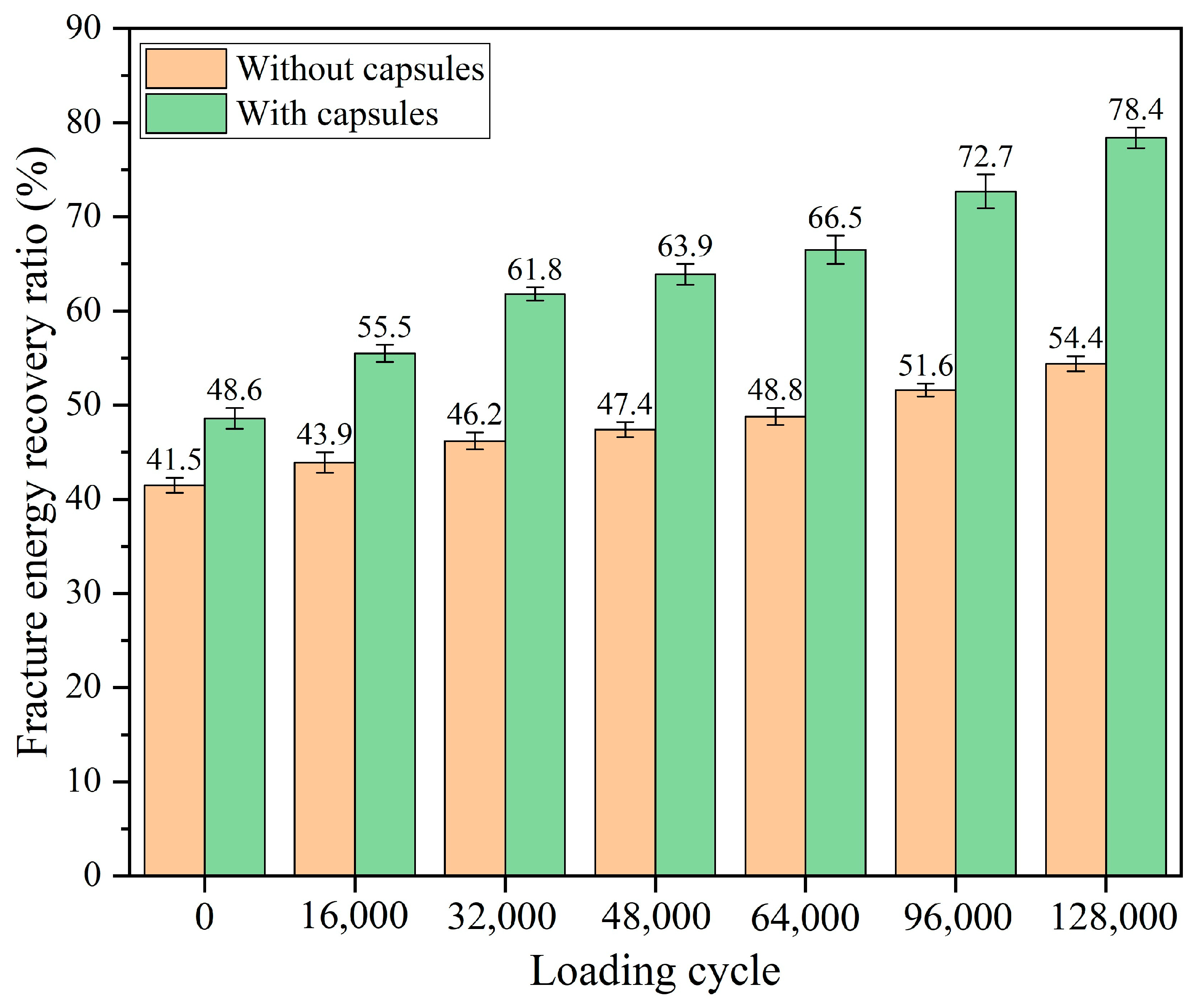 The recovery rates for both strength and fracture energy under different numbers of load cycles are presented in Figure 8 and Figure 9, respectively, where no capsule indicates ordinary asphalt concrete without capsules and capsule indicates asphalt concrete with capsules. After 0, 16,000, 32,000, 48,000, 64,000, 96,000, and 128,000 cycles of load, the strength recovery rates of ordinary asphalt concrete are 38.4%, 40.9%, 42.1%, 42.8%, 43.7%, 44.5%, and 45.8%, respectively, and the fracture recovery rates of ordinary asphalt concrete are 41.5%, 43.9%, 46.2%, 47.4%, 48.8%, 51.6%, and 54.4%, respectively. As a kind of viscoelastic material, asphalt has certain inherent repair characteristics; therefore in the absence of any external load conditions, the strength recovery rate of asphalt concrete could be up to 38%, and the fracture energy recovery rate could be up to 41%. With the increase in load cycle, asphalt concrete beams without capsules gradually become dense under the extrusion of load, the degree of embedding between the aggregates deepens, the bond between the asphalt is tighter, and the fracture surfaces of the concrete are closer to each other under the extrusion; therefore the healing ratio of ordinary beams gradually improved with increasing load cycles.