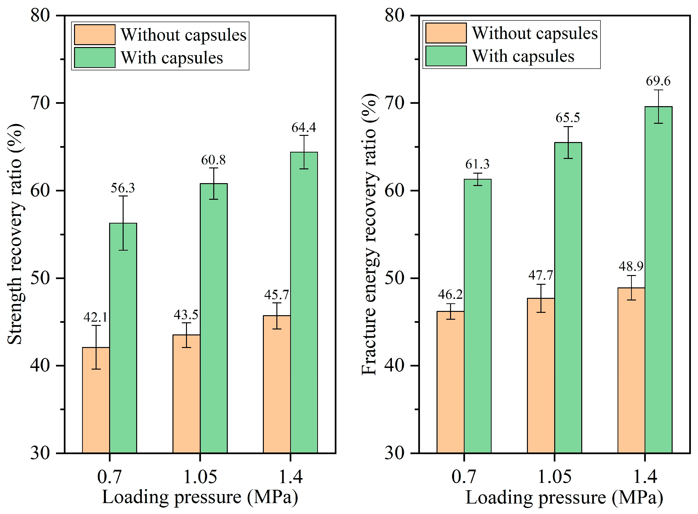 The incorporation of capsules significantly enhances the healing rates of the beams under all three load pressures. Moreover, under a fixed load cycle, the healing rates of capsule-modified beams rise with elevated load pressure. When the load cycle is 128,000, the strength recovery rates of the beam under 0.70 MPa, 1.05 MPa, and 1.40 MPa are 74.9%, 77.4%, and 82.2%, respectively, and the fracture energy recovery ratios are 78.4%, 82.9%, and 88.7%, respectively. This result is attributed to the greater release of sunflower oil from the capsules under higher pressure, which enhanced the softening of the asphalt, accelerated its flow and diffusion around cracks, and thereby improved both the crack closure rate and the recovery of mechanical properties.