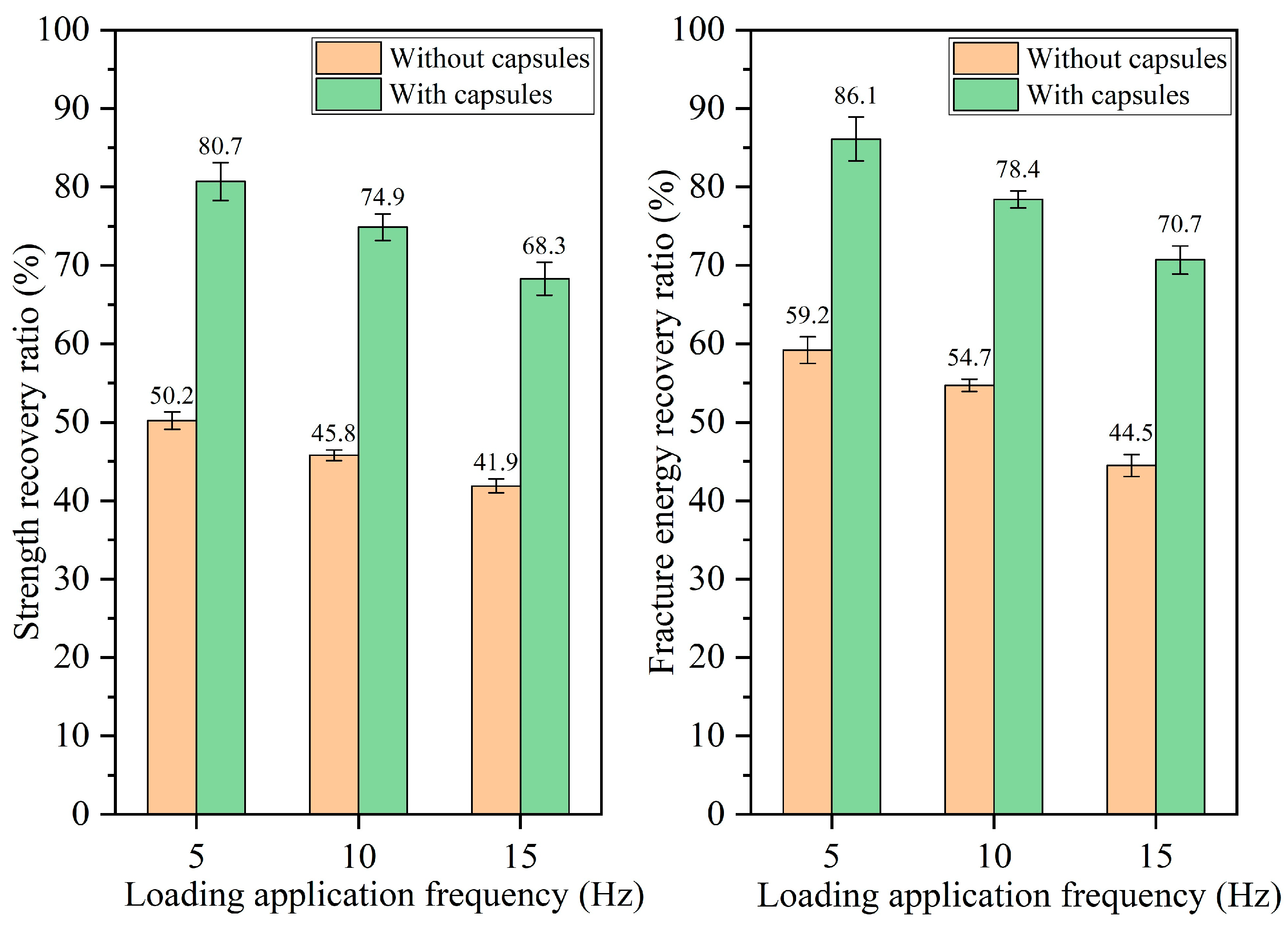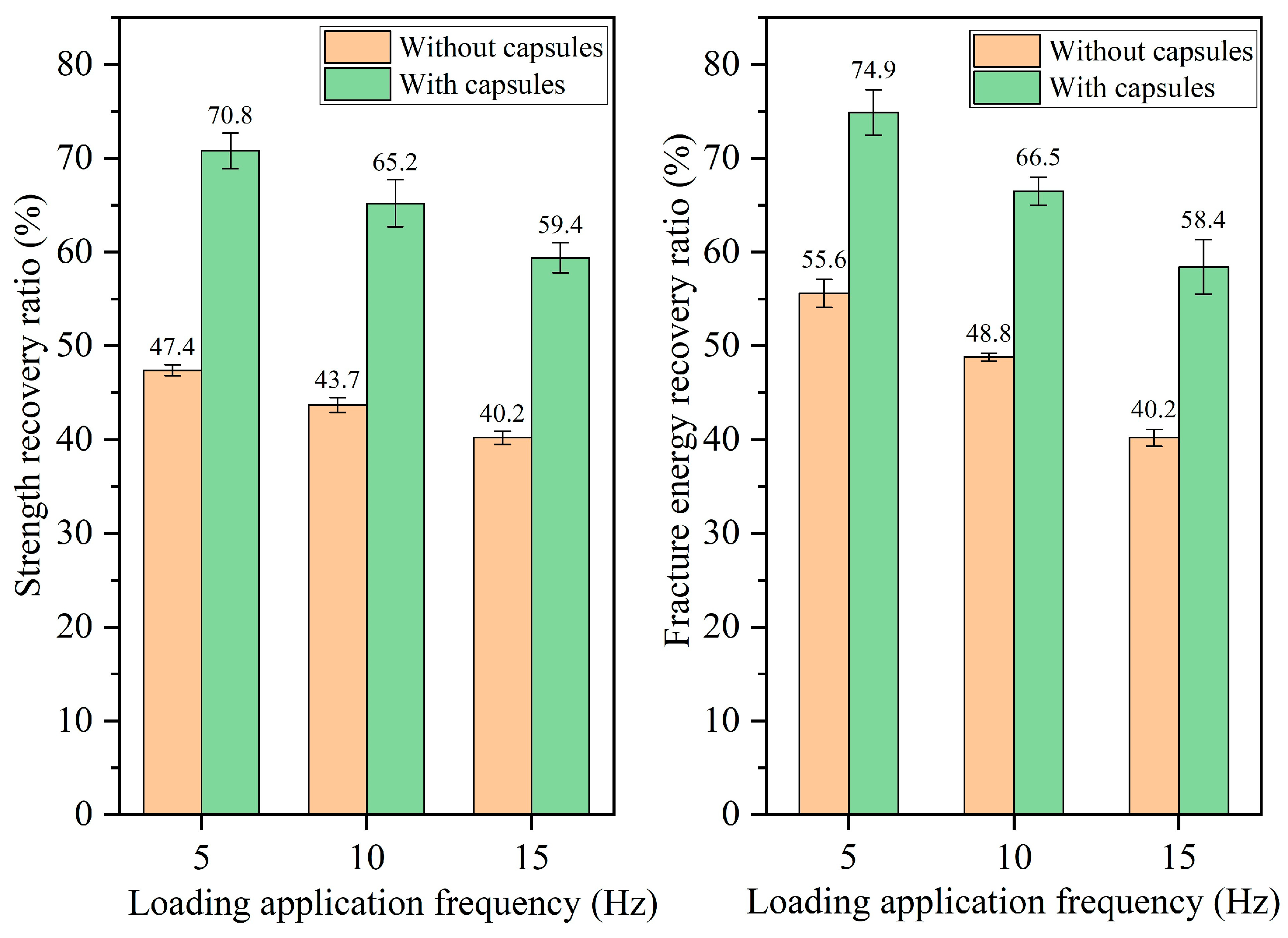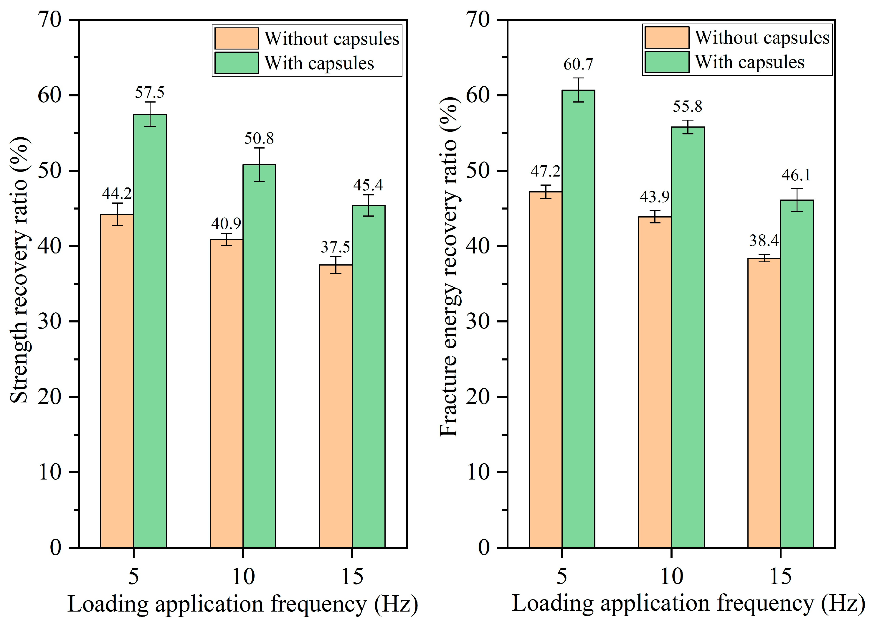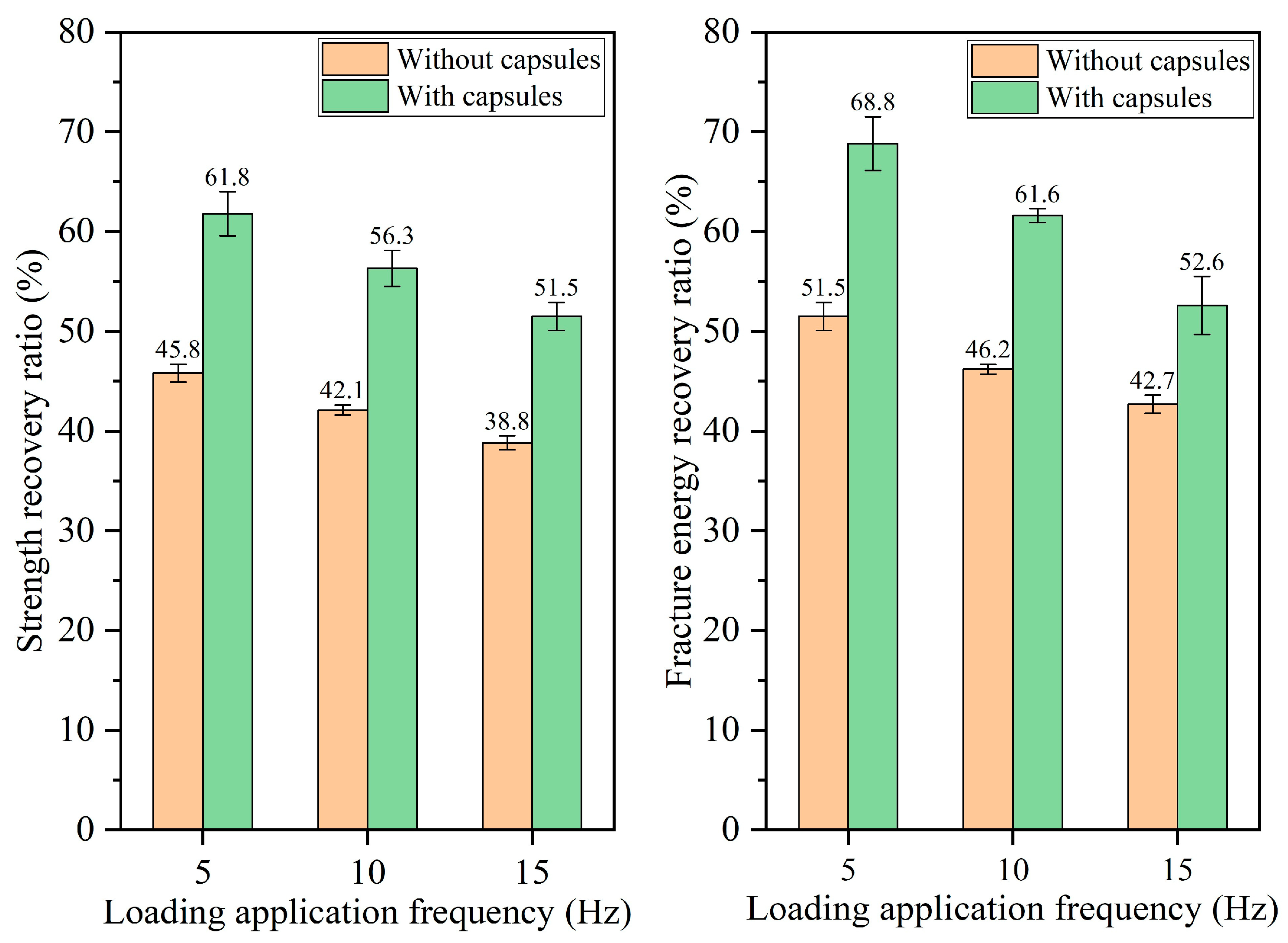 When the capsule is incorporated into asphalt concrete, regardless of the load frequency, the capsule-embedded beams exhibit superior healing rates compared to ordinary beams under identical load conditions, demonstrating that variations in vehicle speed can activate the capsules and enhance the self-healing capacity of cracked beams. At a constant number of load cycles, the healing efficiency of asphalt concrete declines at higher frequencies. For example, when the number of loads is 128,000, the strength recovery rates of capsule-modified beams under different load frequencies of 5 Hz, 10 Hz, and 15 Hz are 80.7%, 74.9%, and 68.3%, respectively, and the corresponding fracture energy recovery rates are 86.1%, 78.4%, and 70.7%, respectively. Under a fixed load cycle, higher load frequency leads to lower total load time of beams in cyclic load and makes the load action time on the capsules become shorter, which will make the capsules release less rejuvenator and thus reduces the healing ratio of capsule-modified beams.