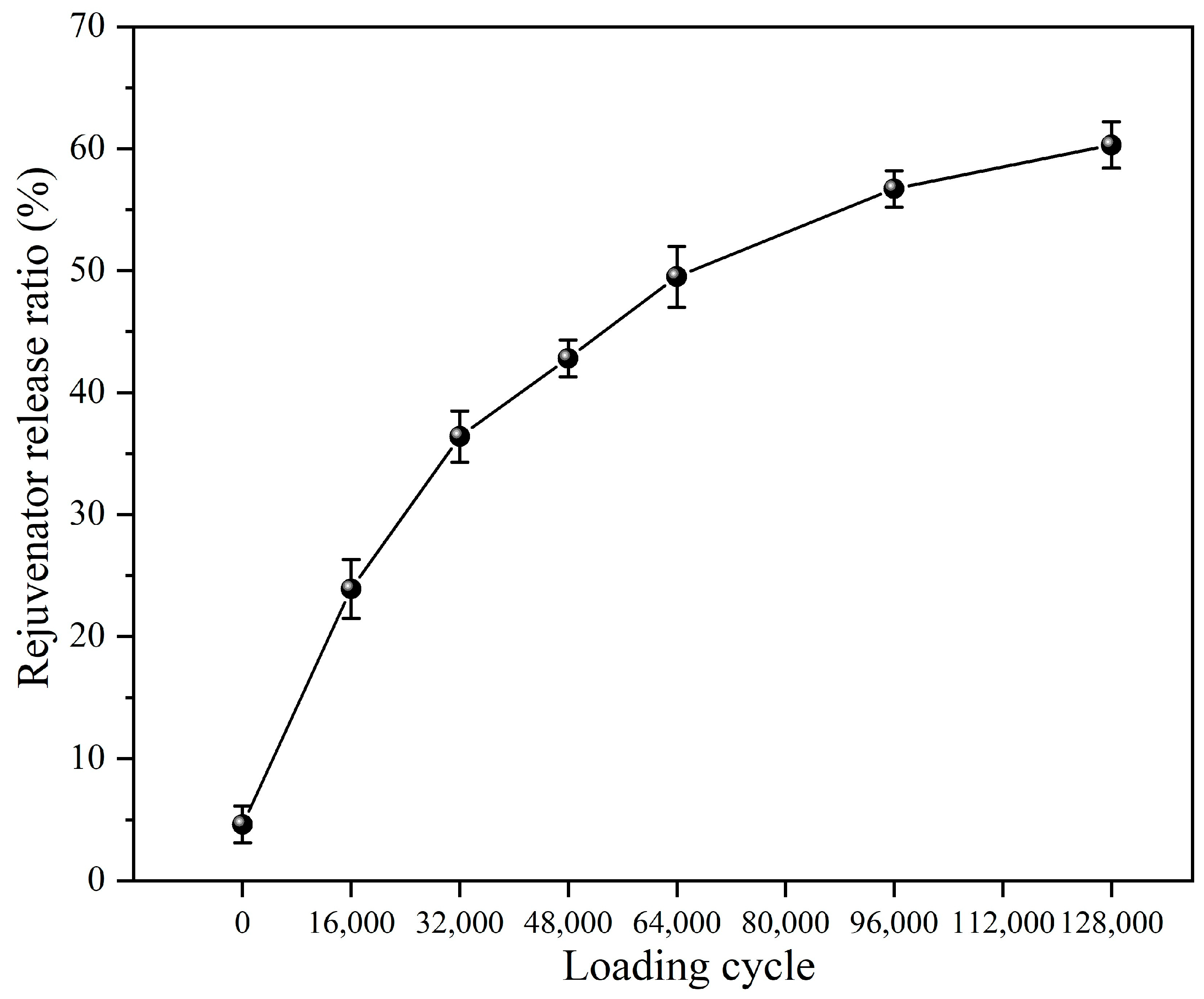 Figure 18 depicts the release ratio of the rejuvenator from capsules embedded in beams after varying cycles of load. The rejuvenator release ratios are 23.9%, 36.4%, 42.8%, 49.5%, 56.7%, and 60.3% after the asphalt concrete undergoes 16,000, 32,000, 48,000, 64,000, 96,000, and 128,000 load cycles, demonstrating a clear upward trend. As the load cycle increases, the response time of the capsules increases and the internal chamber extrusion time also increases, which improves the rejuvenator release ratio. The load–response release characterization of the capsules shows that the multi-chamber capsules have the ability of a long-lasting sustained release feature. In the cyclic load process, calcium–alginate composite capsules gradually release inner rejuvenator rather than releasing all the encapsulated rejuvenator at once, thus promoting sustainable healing in the asphalt concrete.