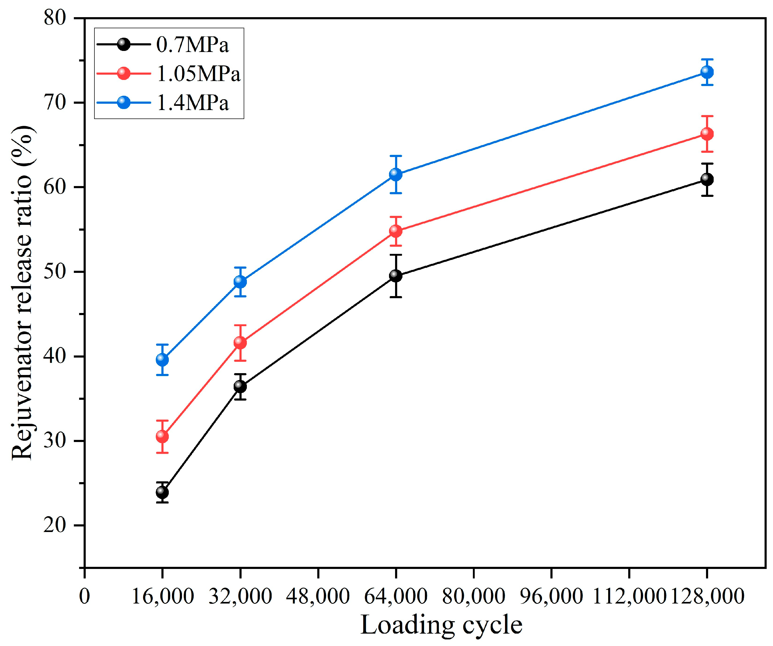 The rejuvenator release features of capsules in asphalt concrete under different load pressures are shown in Figure 19. In general, under three types of load pressure, the rejuvenator release ratio increases with the load cycle, which indicates that the capsules in beams still present a sustained release feature under different load pressures. A positive correlation is observed between the rejuvenator release ratio and the applied load pressure under a constant number of load cycles. Specifically, under 32,000 cycles of load, the release ratio increases from 36.4% to 48.8% as the pressure rises from 0.70 MPa to 1.40 MPa. This suggests that higher vehicle tire pressures, under equivalent traffic volume, will promote a more substantial release of the rejuvenator. Overloading accelerates the release of rejuvenating agents, which may expedite crack closure and repair, thereby mitigating damage to asphalt pavements under severe traffic loading conditions.