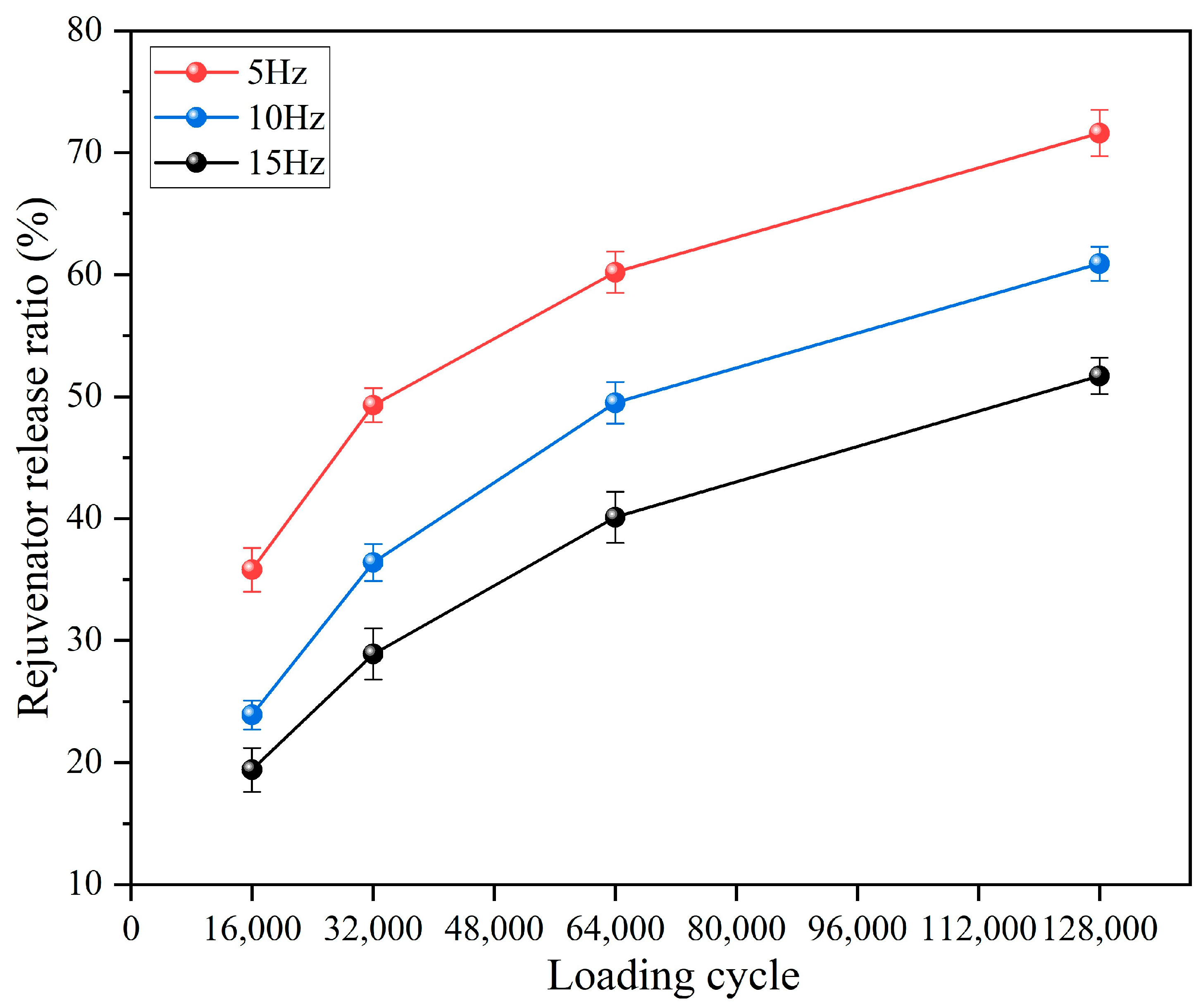 As shown in Figure 20, the rejuvenator release ratio consistently increases with the number of load cycles under all three tested frequencies. This indicates that capsule activation and healing agent release occur under vehicular load irrespective of traffic speed, ensuring functionality throughout the pavement’s service life. Under a fixed load cycle, the rejuvenator release ratios reduce as the load frequency application increases. For example, under 64,000 cycles of load, the rejuvenator release ratios are 60.2%, 49.5%, and 40.1% at load application frequency of 5 Hz, 10 Hz, and 15 Hz, respectively. When the total load cycles are unchanged, higher load frequency leads to shorter single load action time, which means that the total stress action time on capsules will reduce and the released rejuvenator will decrease. Excessive speed accelerates the performance degradation of asphalt pavements, while the release of rejuvenators within capsules may slow the deterioration of the service performance.