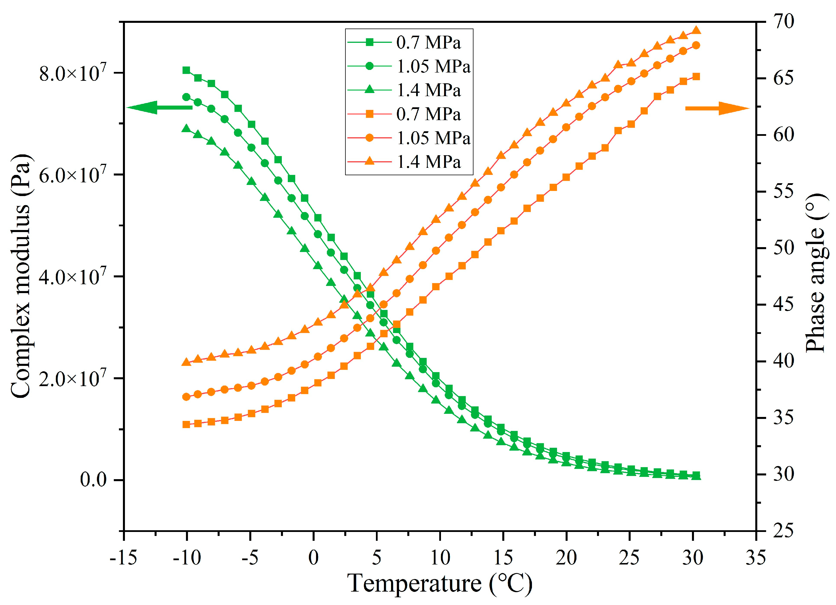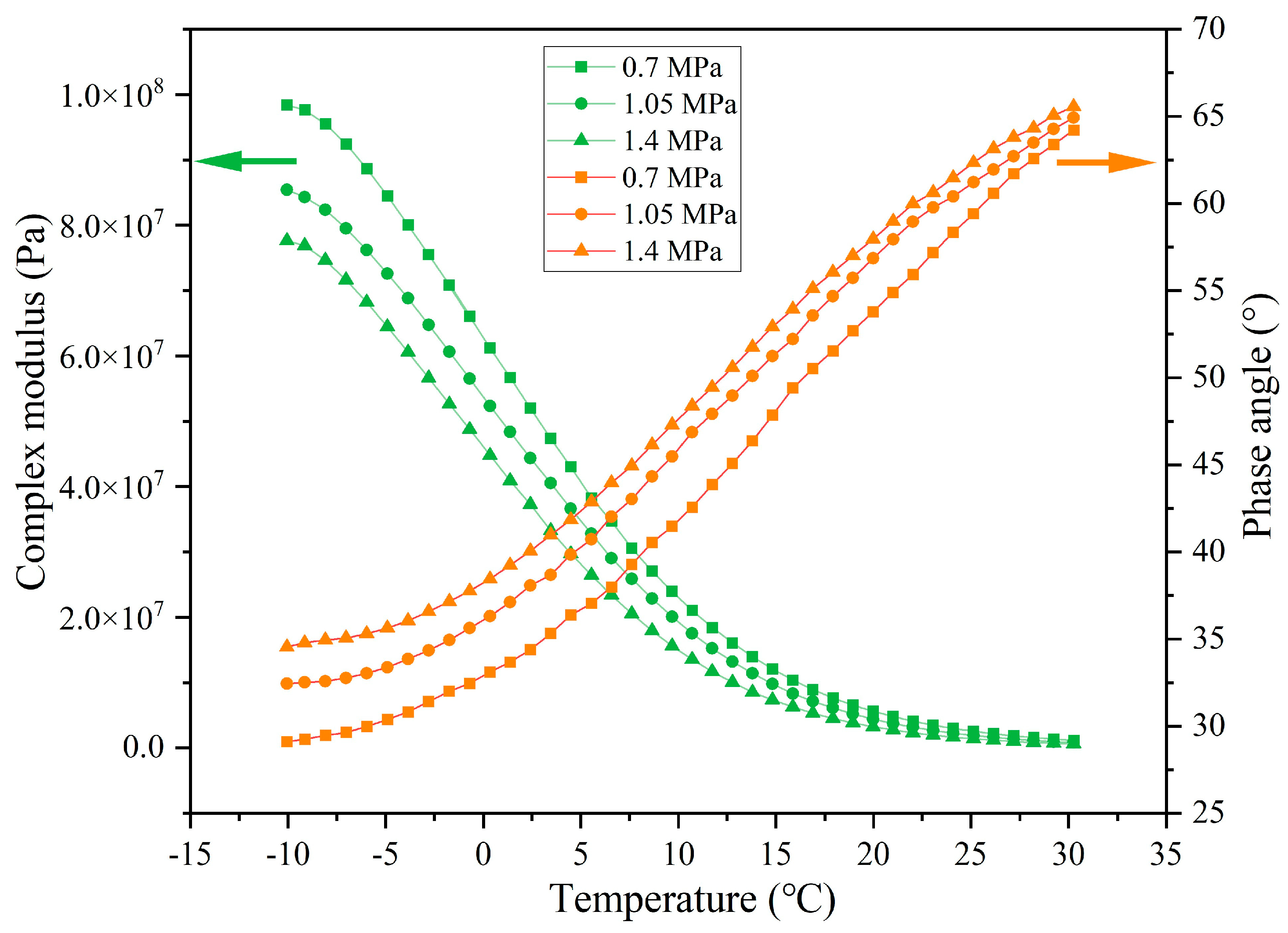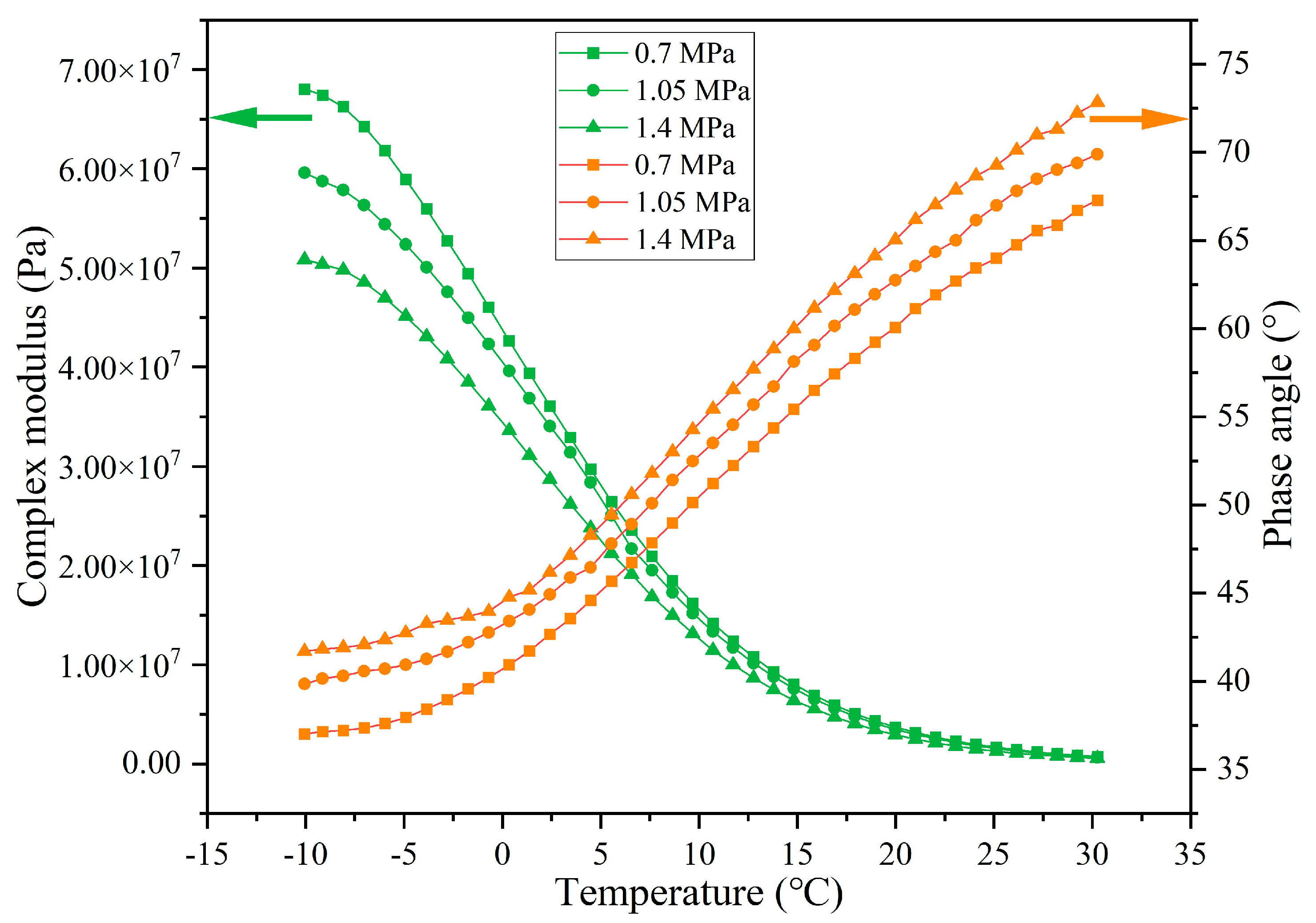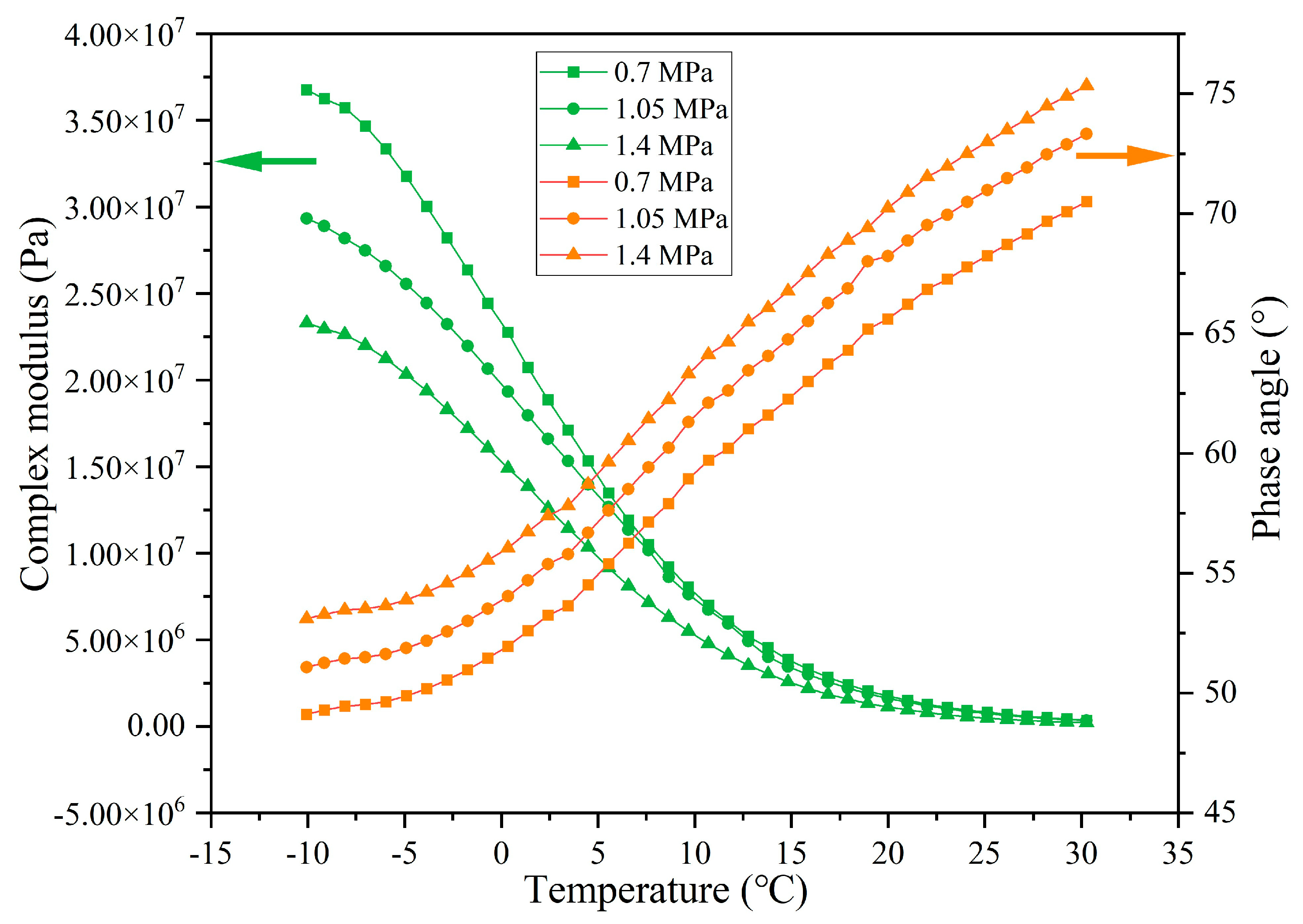 Vegetable oil improves the flow properties of asphalt binder, thereby enhancing its low-temperature crack resistance. To evaluate the rheological behavior of the binder after cyclic load, an oscillatory temperature sweep test is performed using a dynamic shear rheometer (Smartpave 102, Anton Paar, Graz, Austria). The test ranges from −10 °C to 30 °C using an 8 mm rotor, at a fixed strain of 0.05% and a frequency of 10 rad/s. Each experimental group is replicated three times in parallel. The average of the three trial results was taken as the final experimental result.