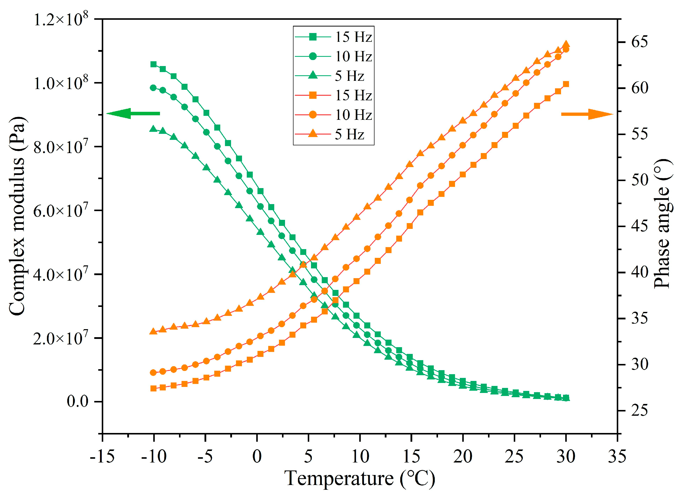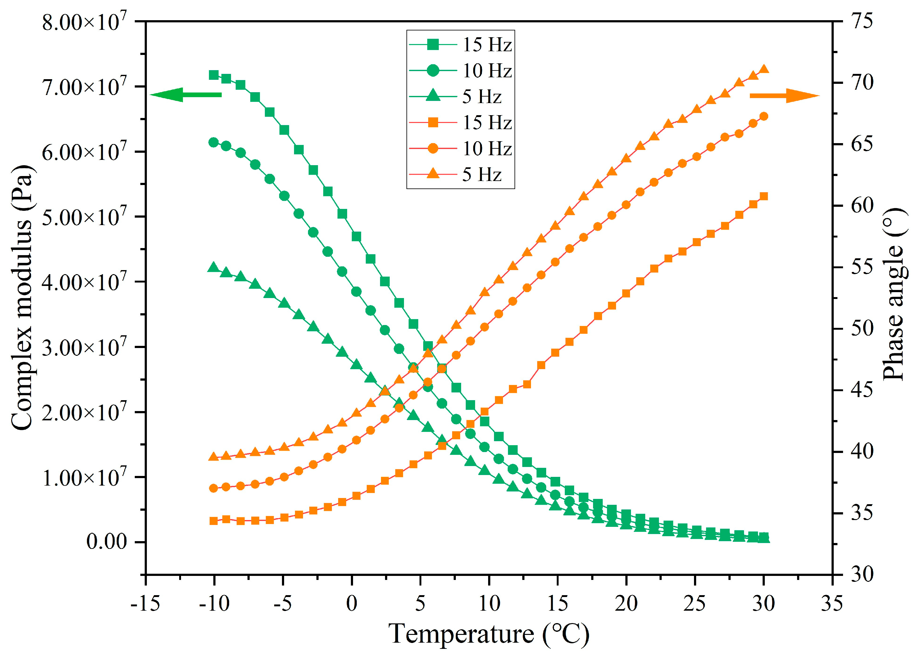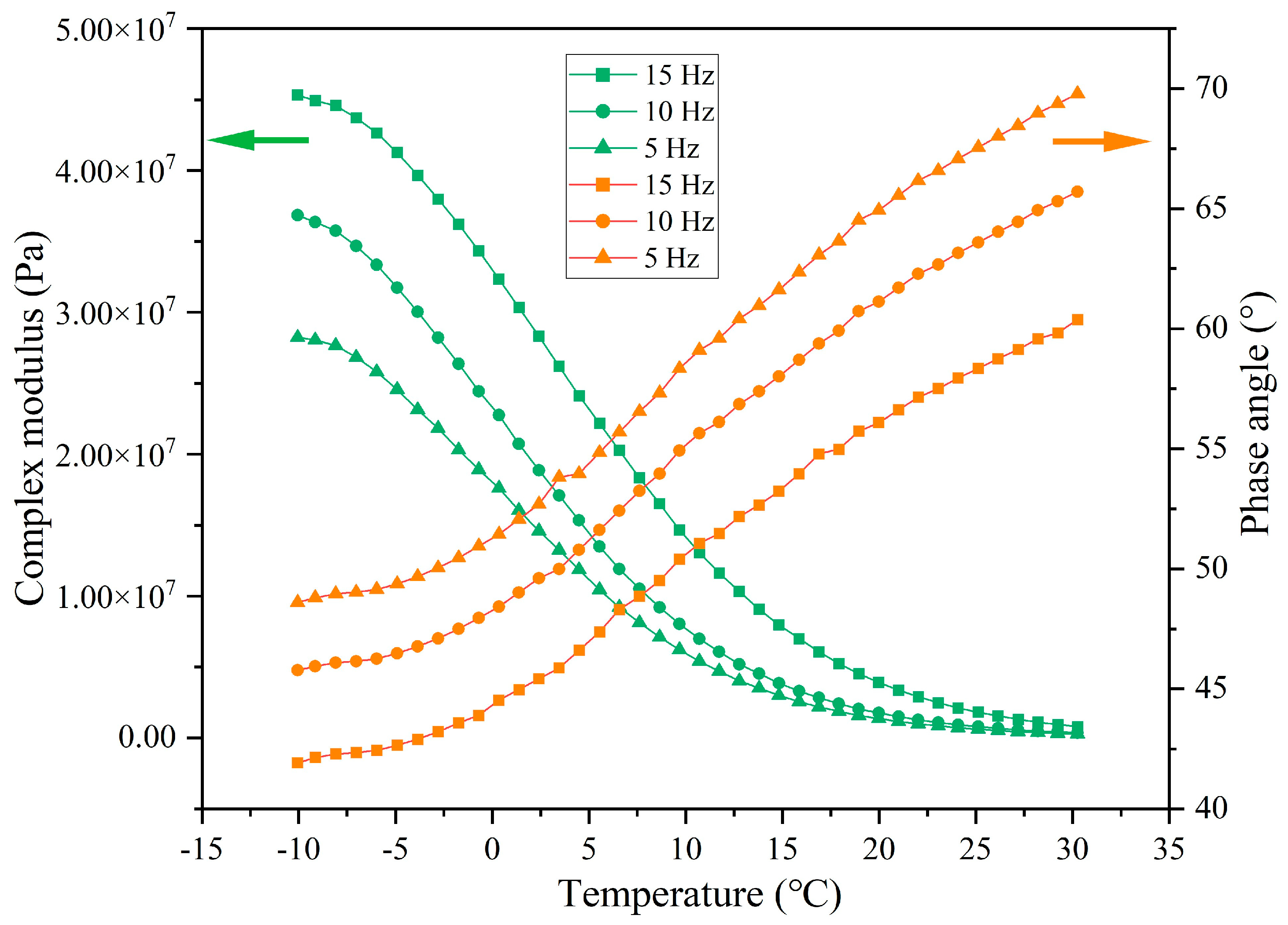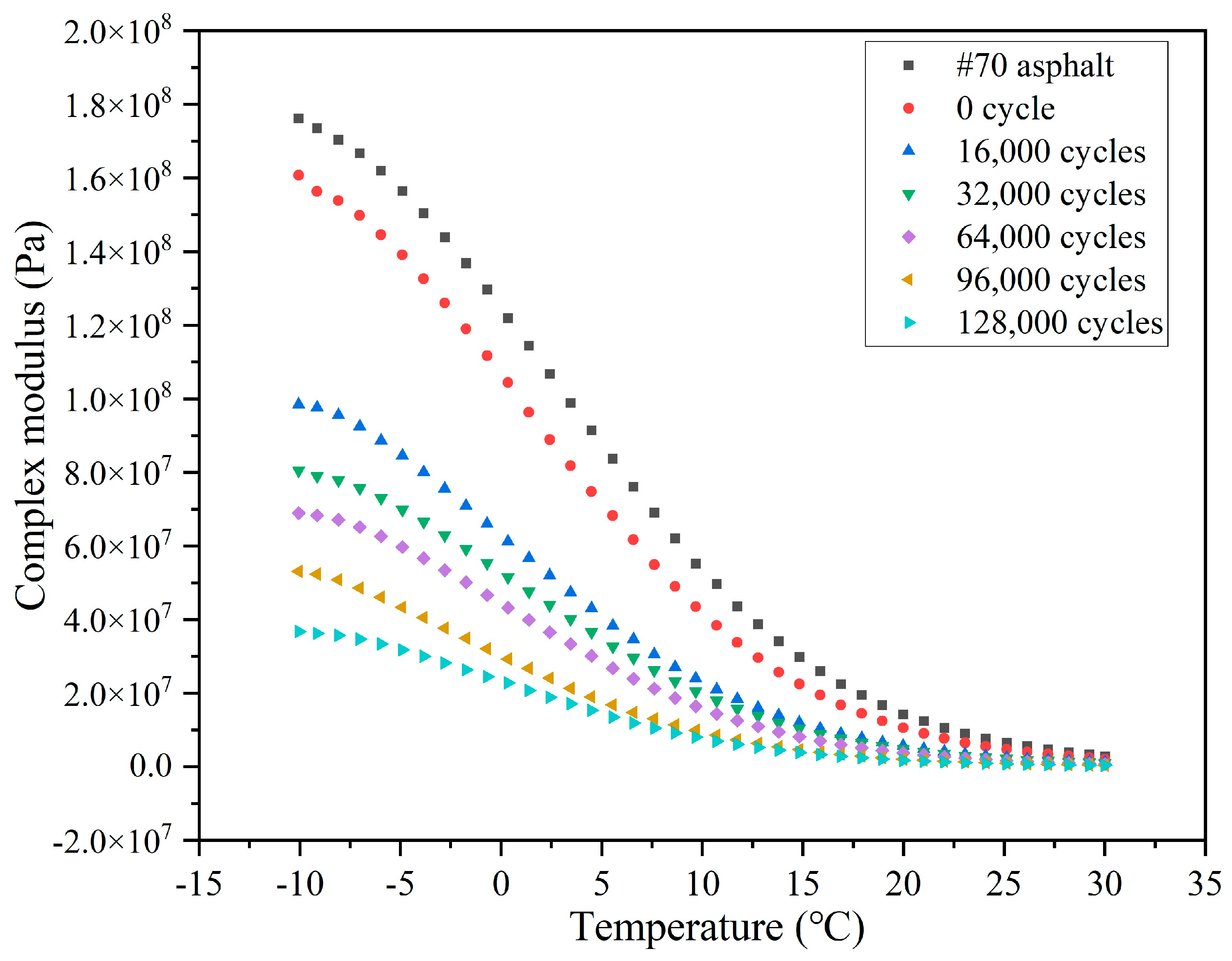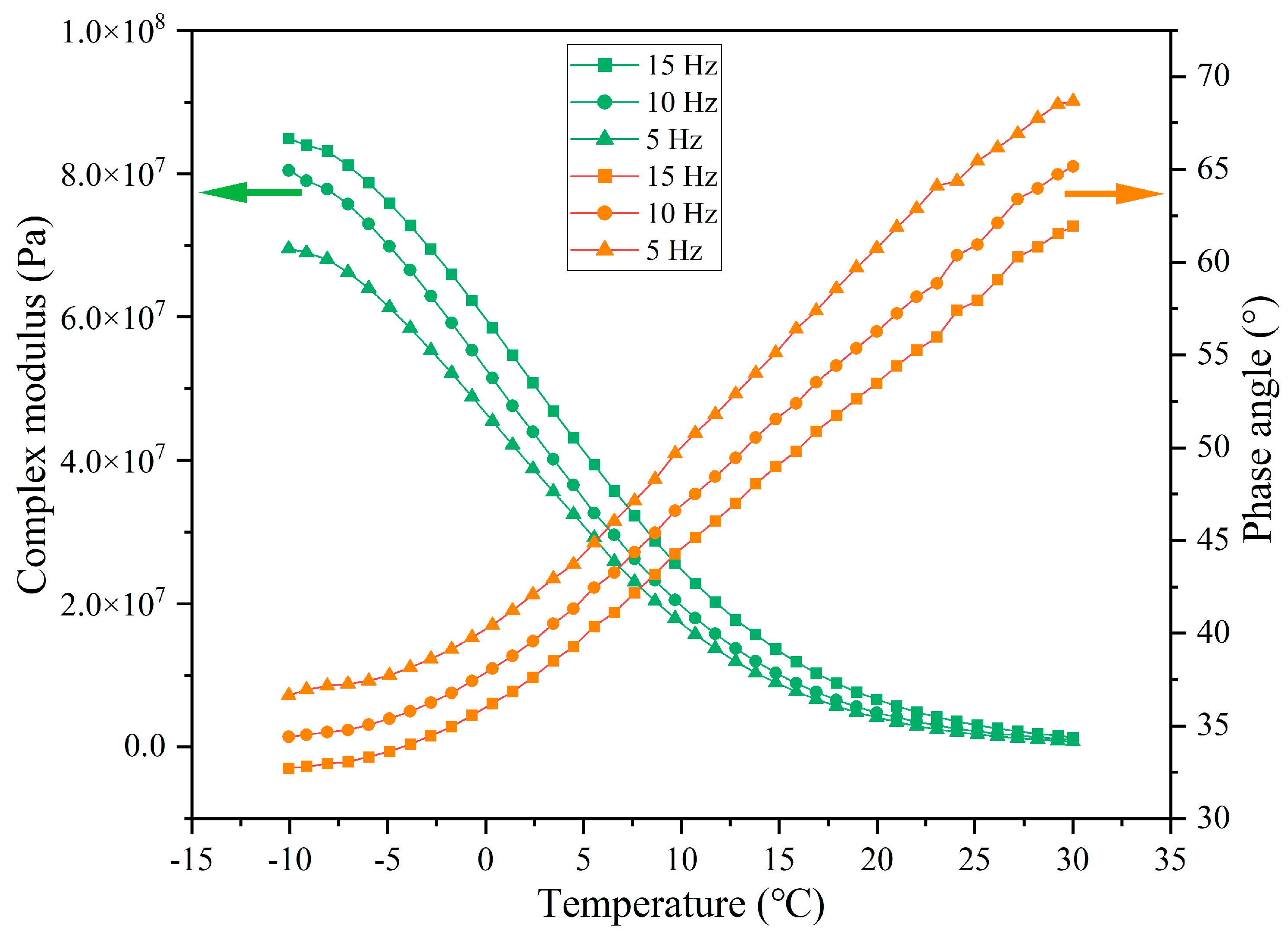 Vegetable oil improves the flow properties of asphalt binder, thereby enhancing its low-temperature crack resistance. To evaluate the rheological behavior of the binder after cyclic load, an oscillatory temperature sweep test is performed using a dynamic shear rheometer (Smartpave 102, Anton Paar, Graz, Austria). The test ranges from −10 °C to 30 °C using an 8 mm rotor, at a fixed strain of 0.05% and a frequency of 10 rad/s. Each experimental group is replicated three times in parallel. The average of the three trial results was taken as the final experimental result.