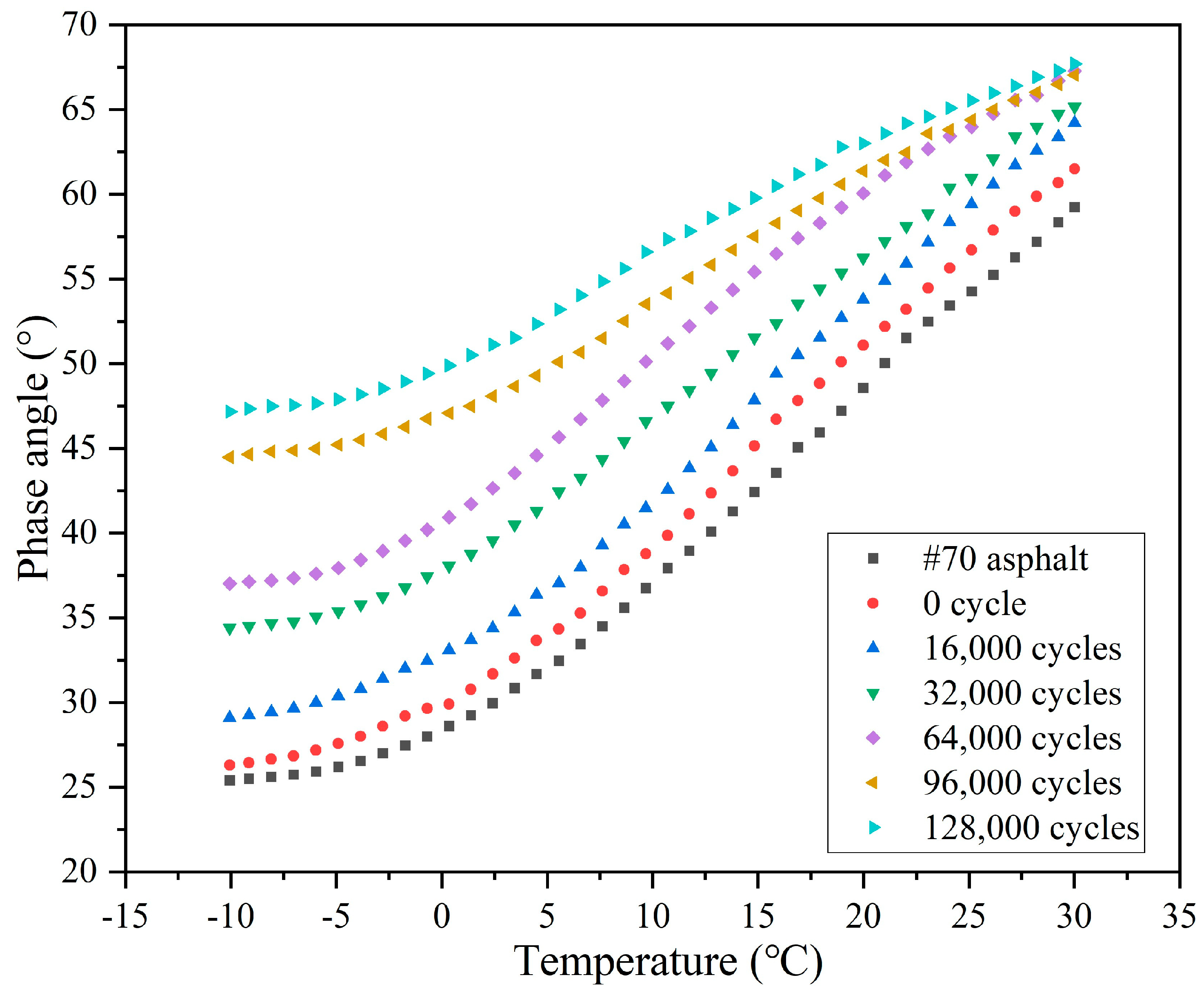 In comparison to the base 70 asphalt, the G*of the asphalt without external cyclic load decreases slightly and the phase angle increases slightly, as shown by the decrease in G* from 1.76 × 108 to 1.61 × 108 and the increase in δ from 25.4° to 26.3° at −10 °C. The premature release of a small quantity (4.5%) of sunflower oil from the capsules in the mixing and compaction period lead to a slight softening of the asphalt, which is evidenced by a reduction in G* and a rise in δ.