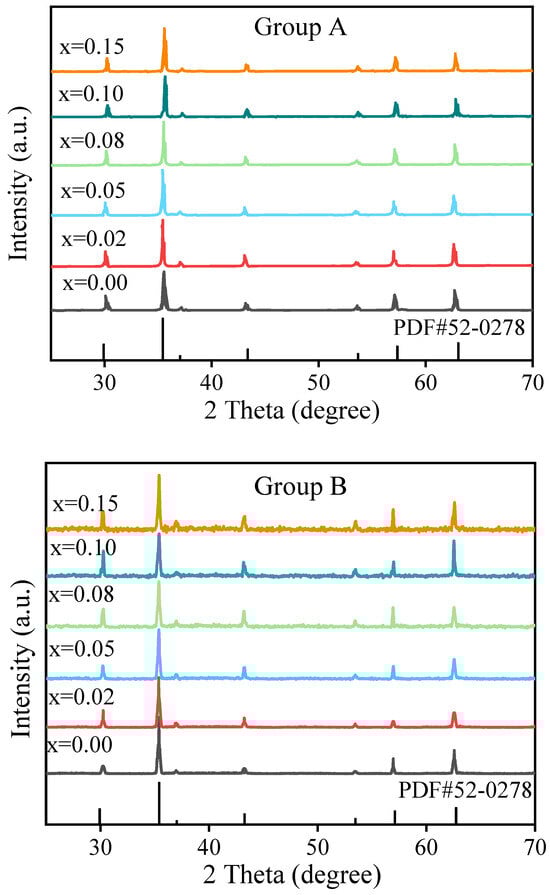 Generally, the bulk density of NiCuZn ferrites is closely related to their sintered densification behavior and final grain size. The small grain size and low densification degree indicate that NiCuZn ferrite has a low bulk density [,]. The SEM images of the microstructure displayed in Figure 3 and Figure 4 revealed that as the content of CaTiO3 or BaTiO3 increased, the effect of crystal growth inhibition became more pronounced, resulting in a gradual reduction in grain size and densification of the NiCuZn ferrite. In particular, when x = 0.08 and 0.15, the grain size of the NiCuZn samples decreased sharply. Therefore, corresponding to the results in Figure 6, the bulk density of the NiCuZn sample in group A and group B both showed a rapid decrease when x = 0.08 and 0.15. Moreover, it was also found that the bulk density of NiCuZn containing BMLS-CaTiO3 was lower than that of NiCuZn containing BMLS-BaTiO3 when the additive content was the same. This may be attributed to the density difference between CaTiO3 and BaTiO3. Since CaTiO3 has a lower density (4.1 g/cm3) than BaTiO3 (6.08 g/cm3), when the additive content was the same, CaTiO3 could occupy larger spatial positions and exhibited a more significant effect of crystal growth inhibition, resulting in more grain boundaries formed and smaller grains generated than BaTiO3, whereby the degree of densification decreased sharply. As a consequence, the NiCuZn sample with added BMLS-CaTiO3 had a lower bulk density than the NiCuZn sample with added BMLS-BaTiO3 at the same additive content. Furthermore, a synergistic effect on the microstructure is evident when correlating the bulk density, lattice strain, and grain size. The decline in density, coupled with the increasing microstrain and decreasing grain size, consistently points towards the role of Ca/BaTiO3 additives in inhibiting densification and grain growth through a pinning mechanism, ultimately resulting in smaller grain sizes and higher porosity in the structure.