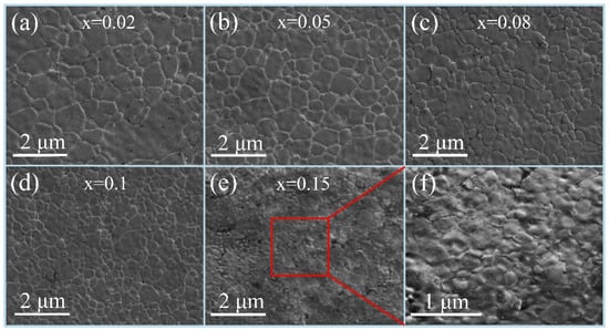 Specifically, when x = 0.02, Figure 3a and Figure 4a showed that both large-sized and small-sized grains were simultaneously present in NiCuZn ferrite. The reason may be attributed to the relatively low content of CaTiO3 or BaTiO3, which exhibited a limited effect of crystal growth inhibition on grain growth. At a content of 0.05 wt% CaTiO3 or BaTiO3 (Figure 3b and Figure 4b), although the grain size decreased slightly, the grain size homogeneity was significantly improved compared to that in Figure 3a and Figure 4a, which indicated that the appropriate content of CaTiO3 or BaTiO3 was 0.05 wt%. When x = 0.08, 0.10, and 0.15, it can be observed that as the content of CaTiO3 or BaTiO3 further increased, the grain size and densification degree of the NiCuZn samples decreased rapidly. In particular, when x = 0.15, it was almost impossible to distinguish the grain morphology from Figure 3e and Figure 4e. The SEM images in Figure 3f and Figure 4f were locally enlarged images of Figure 3e and Figure 4e, respectively. From the local enlarged images, it could be seen that the grain size of the NiCuZn samples in group A and group B both became very small, and the grain boundaries also became very blurred. This is mainly due to the excessive addition of CaTiO3 or BaTiO3, which utilizes the effect of crystal growth inhibition to make the diffusion of the liquid-phase material difficult during the sintering process, resulting in the formation of small-sized grains, blurred grain boundaries, and decreased densification degree []. The microstructure characterization indicates that the addition of CaTiO3 or BaTiO3 significantly changes the grain size, homogeneity, and densification degree of the NiCuZn ferrites. When the content of CaTiO3 or BaTiO3 is 0.05 wt%, the NiCuZn samples in group A and group B both obtained relatively uniform grain size and dense microstructure.